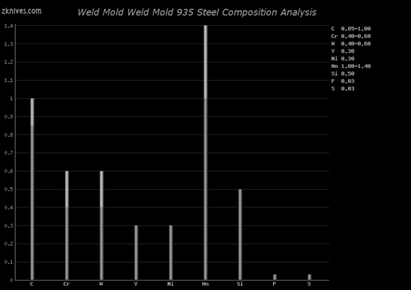 Weld Mold 935(焊接模具) - 流行的锻钢。被许多定制制造商和大众制造商使用,包括 Randall。良好的边缘稳定性和耐磨性,不如 AISI A2 或其同等产品坚韧,但在该部门仍然相当好。可以达到 65HRC,并且作为轻型/中型铣刀与精加工刃配合得很好。Randal 在 56HRC 左右使用它,其他制造商在 56-58HRC 左右使用它来制造较大的刀具,以及高于该比例的中/小型刀具。如果您正在寻找一把硬用刀,坩埚 CPM 3V、AISI L6 或 AISI A2 及其同类产品都是更好的选择。对于小刀,它在高硬度下绝对表现更好。