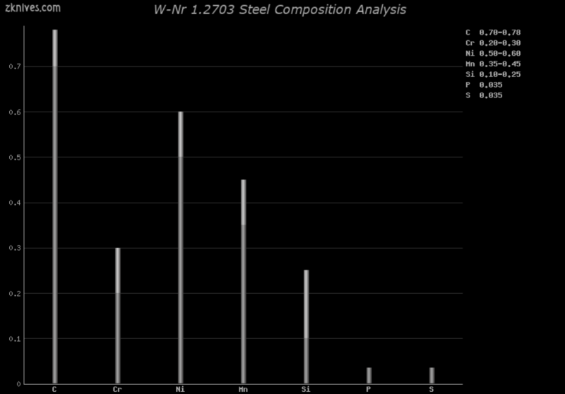 1.2703(W-Nr) - 低合金冷作工具钢。最初是为锯子设计的。就它在刀具中的使用而言,它用于文件夹和更大的固定刀片。最大可以做 60HRC 左右。耐磨性好,韧性好。