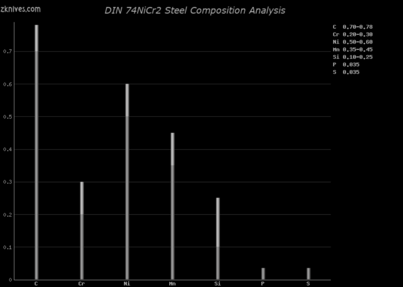 74NiCr2(DIN) - 低合金冷作工具钢。最初是为锯子设计的。就它在刀具中的使用而言,它用于文件夹和更大的固定刀片。最大可以做 60HRC 左右。耐磨性好,韧性好。