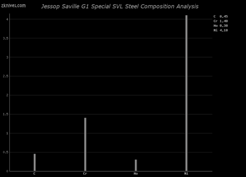 G1 Special SVL(Jessop Saville) - 这是标准 41/4% 镍空气/油硬化钢的高碳版本。对于刀子来说,并没有特别令人兴奋的特性。