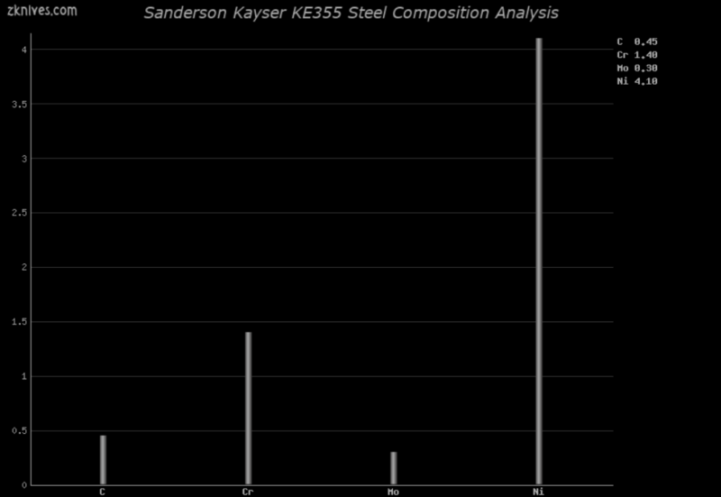 KE355(Sanderson Kayser) - 这是标准 41/4% 镍空气/油硬化钢的高碳版本。对于刀子来说,并没有特别令人兴奋的特性。