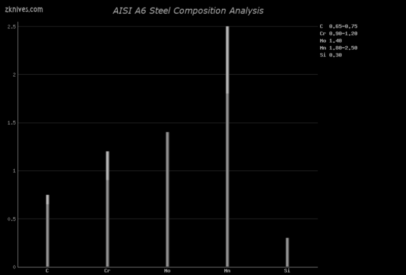 A6(AISI) - 中合金空气硬化工具钢。设计用于坯料、成型模具、剪切刀等。不错的耐磨性,介于 AISI O1 和 AISI D2 工具钢之间。良好的韧性和尺寸稳定性。首次出现在 1990 年左右的 Knives 中。由定制制造商使用,在生产刀具中从未见过。