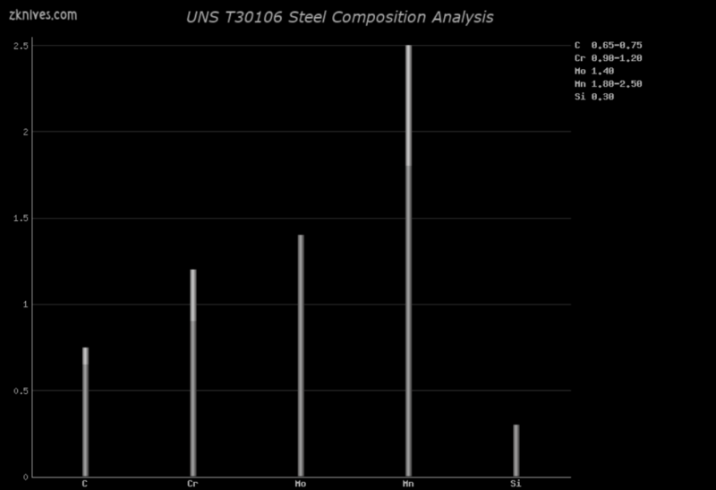 T30106(UNS) - 中合金空气硬化工具钢。设计用于坯料、成型模具、剪切刀等。不错的耐磨性,介于 AISI O1 和 AISI D2 工具钢之间。良好的韧性和尺寸稳定性。首次出现在 1990 年左右的 Knives 中。由定制制造商使用,在生产刀具中从未见过。