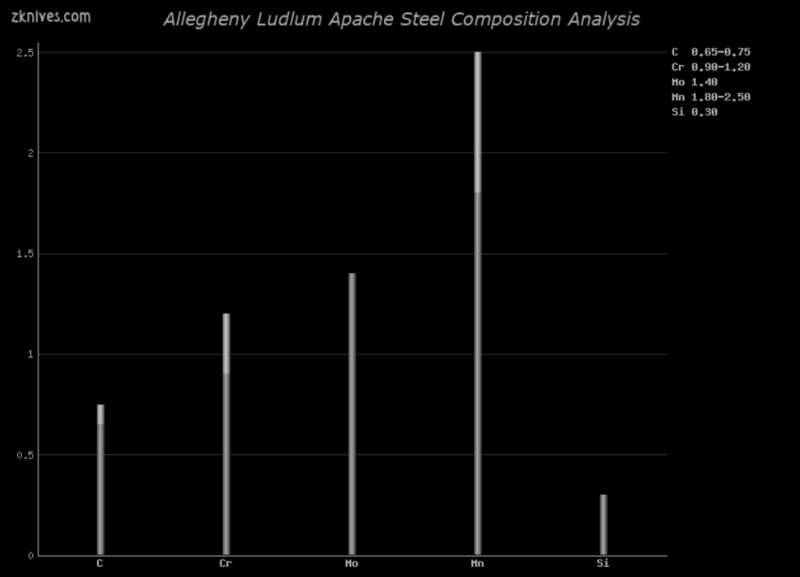 Apache(Allegheny Ludlum) - 中合金空气硬化工具钢。设计用于坯料、成型模具、剪切刀等。不错的耐磨性,介于 AISI O1 和 AISI D2 工具钢之间。良好的韧性和尺寸稳定性。首次出现在 1990 年左右的 Knives 中。由定制制造商使用,在生产刀具中从未见过。