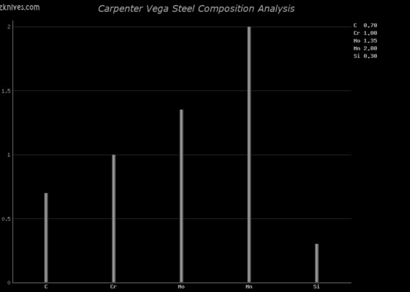 Vega(Carpenter) - 中合金空气硬化工具钢。设计用于坯料、成型模具、剪切刀等。其耐磨性介于 AISI O1 和 AISI D2 工具钢之间,具有良好的韧性和尺寸稳定性。该钢材首次出现在刀具中大约是在1990年,主要用于定制刀具,未见于量产刀具中。