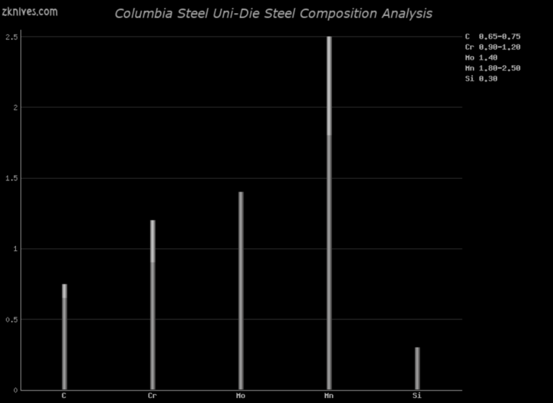 Uni-Die(Columbia Steel) - 中合金空气硬化工具钢。设计用于坯料、成型模具、剪切刀等。不错的耐磨性,介于 AISI O1 和 AISI D2 工具钢之间。具有良好的韧性和尺寸稳定性。首次出现在 1990 年左右的 Knives 中。由定制制造商使用,在生产刀具中从未见过。