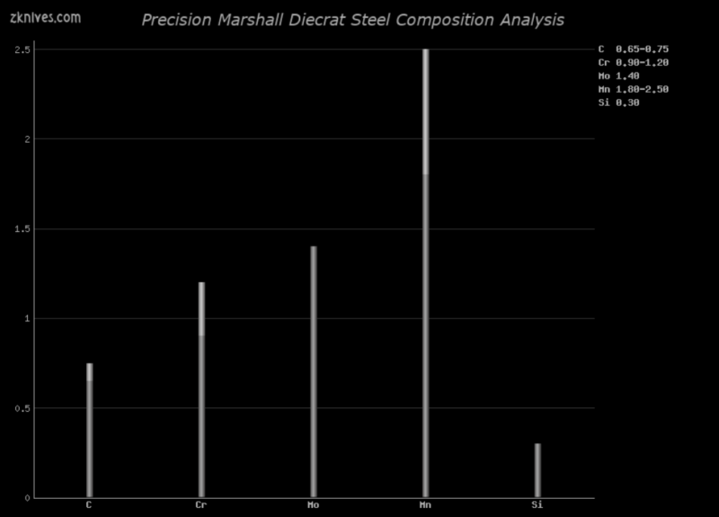 Diecrat(Precision Marshall) - 中等合金空气硬化工具钢。设计用于坯料、成型模具、剪切刀等。不错的耐磨性,介于 AISI O1 和 AISI D2 工具钢之间。良好的韧性和尺寸稳定性。首次出现在 1990 年左右的 Knives 中。由定制制造商使用,在生产刀具中从未见过。