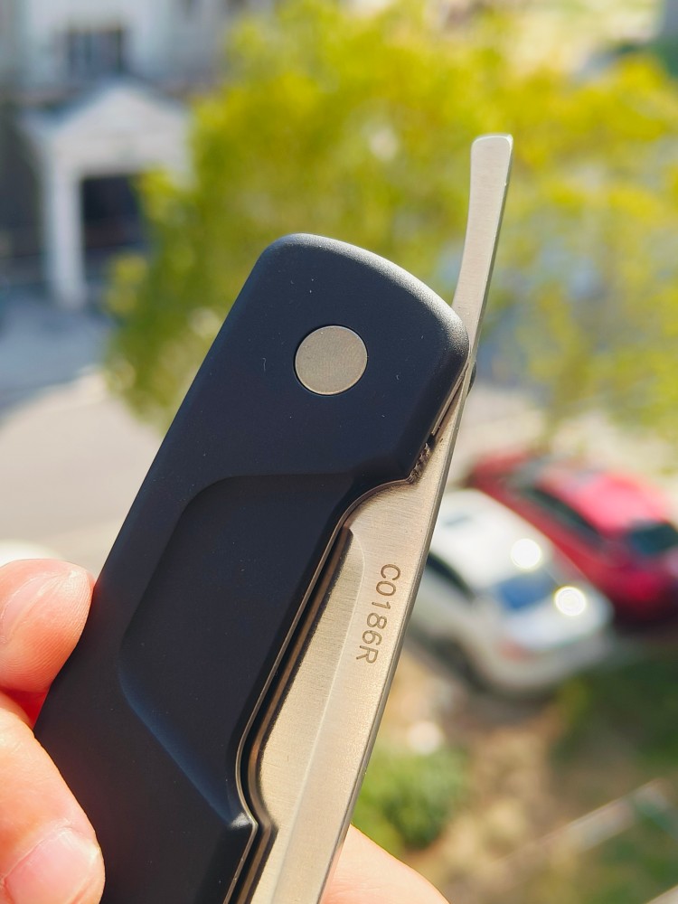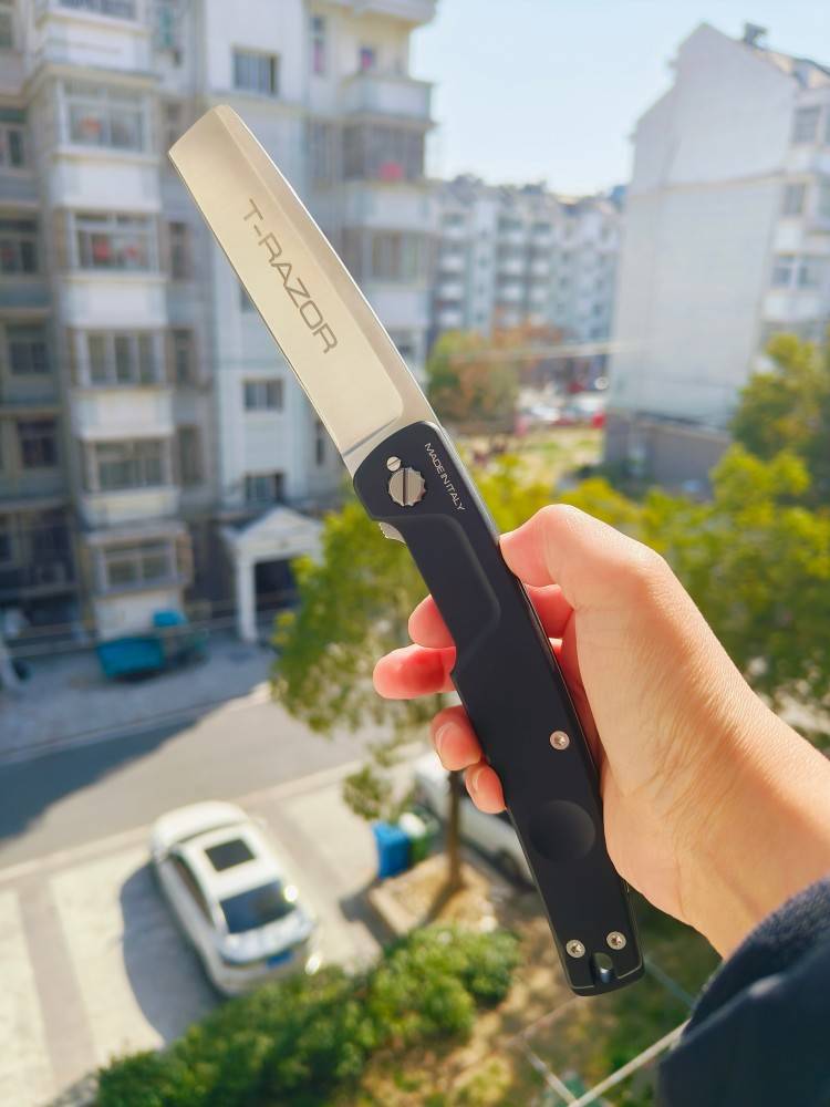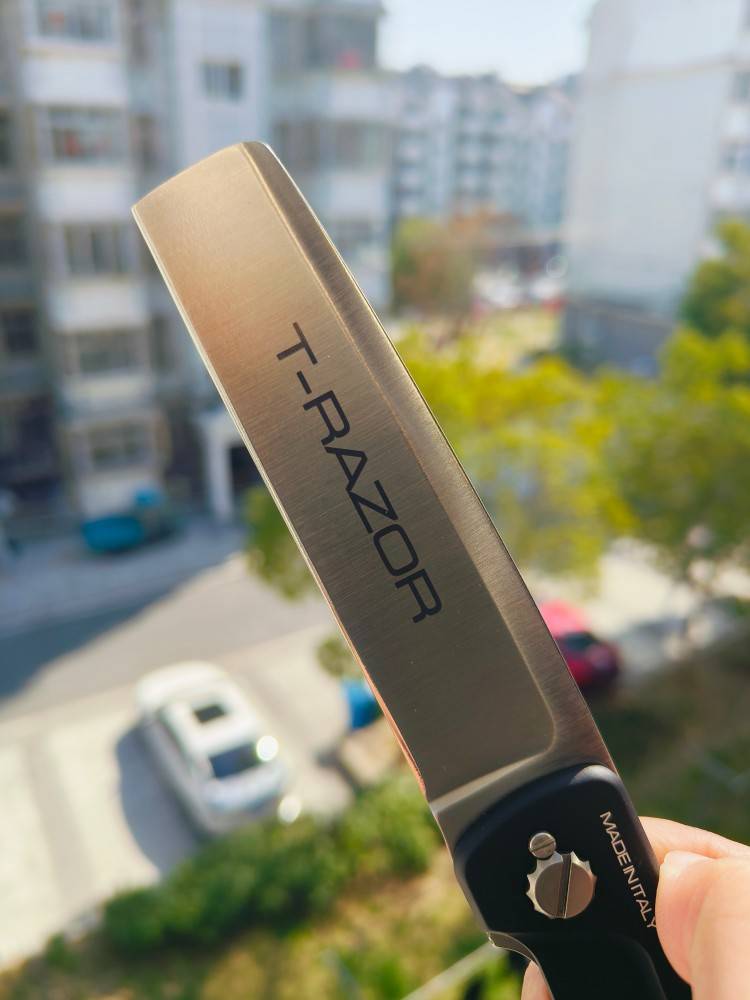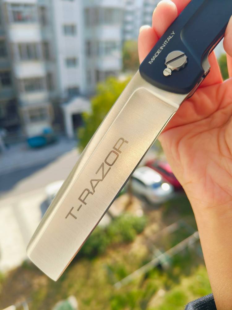 直到 20 世纪初,人们口袋里随身携带一把美工刀还是很常见的事,但随着这些物品“不当使用”的案例不断出现,法律规定必须切割或“切断”刀尖,以限制其危害性。有人认为,将剃刀当作刀携带,充分利用本来就很钝的刀片的切削刃,这是一个好主意,在一定时期内,剃刀成为一种防御手段。 T-RAZOR 的灵感来源于这些以所谓“不正当”方式使用的剃须刀。