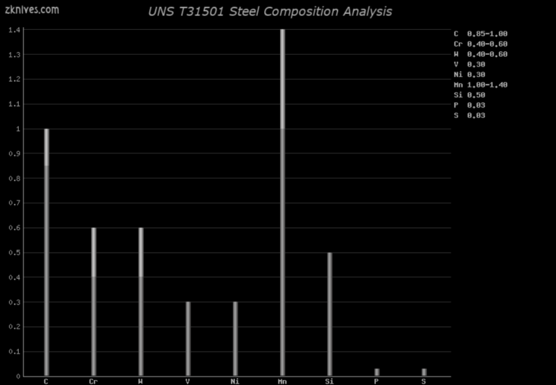 T31501(UNS) - 一种常见的锻造钢材。被许多定制刀具制造商和批量生产商使用,包括Randall。具有良好的刃口稳定性和耐磨性,虽然韧性不如AISI A2或其等效材料,但在这一方面仍然表现不错。可以达到65HRC的硬度,适合作为轻型/中型切割工具的精细刃口。Randall通常将其硬度控制在56HRC左右,而其他制造商在制作较大刀具时通常将其硬度控制在56-58HRC,对于中小型刀具则会更高。如果你需要一把高强度使用的刀具,Crucible CPM 3V、AISI L6或AISI A2及其等效材料会是更好的选择。对于小型刀具,T31501在高硬度下表现更佳。