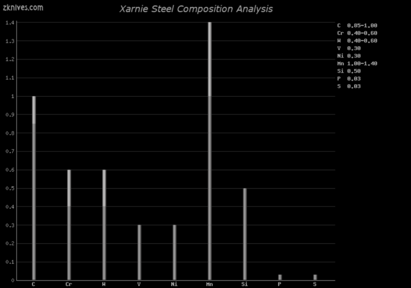 Xarnie(?) - 一种常见的锻造钢材。被许多定制刀具制造商和批量生产商使用,包括Randall。具有良好的刃口稳定性和耐磨性,虽然韧性不如AISI A2或其等效材料,但在这一方面仍然表现不错。可以达到65HRC的硬度,适合作为轻型/中型切割工具的精细刃口。Randall通常将其硬度控制在56HRC左右,而其他制造商在制作较大刀具时通常将其硬度控制在56-58HRC,对于中小型刀具则会更高。如果你需要一把高强度使用的刀具,Crucible CPM 3V、AISI L6或AISI A2及其等效材料会是更好的选择。对于小型刀具,Xarnie在高硬度下表现更佳。