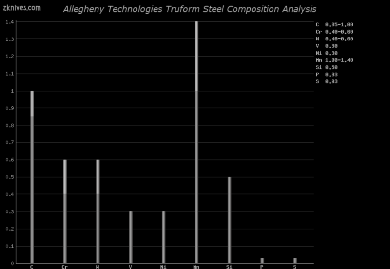 Truform(Allegheny Technologies) - 一种常见的锻造钢材。被许多定制刀具制造商和批量生产商使用,包括Randall。具有良好的刃口稳定性和耐磨性,虽然韧性不如AISI A2或其等效材料,但在这一方面仍然表现不错。可以达到65HRC的硬度,适合作为轻型/中型切割工具的精细刃口。Randall通常将其硬度控制在56HRC左右,而其他制造商在制作较大刀具时通常将其硬度控制在56-58HRC,对于中小型刀具则会更高。如果你需要一把高强度使用的刀具,Crucible CPM 3V、AISI L6或AISI A2及其等效材料会是更好的选择。对于小型刀具,Truform在高硬度下表现更佳。