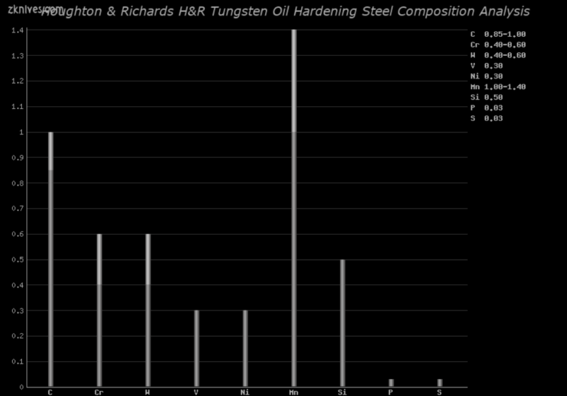 H&R钨油淬火钢(Houghton & Richards) - 一种常见的锻造钢材。被许多定制刀具制造商和批量生产商使用,包括Randall。具有良好的刃口稳定性和耐磨性,虽然韧性不如AISI A2或其等效材料,但在这一方面仍然表现不错。可以达到65HRC的硬度,适合作为轻型/中型切割工具的精细刃口。Randall通常将其硬度控制在56HRC左右,而其他制造商在制作较大刀具时通常将其硬度控制在56-58HRC,对于中小型刀具则会更高。如果你需要一把高强度使用的刀具,Crucible CPM 3V、AISI L6或AISI A2及其等效材料会是更好的选择。对于小型刀具,H&R钨油淬火钢在高硬度下表现更佳。