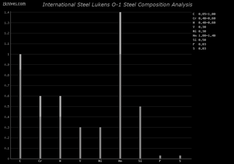 Lukens O-1(International Steel) - 一种常见的锻造钢材。被许多定制刀具制造商和批量生产商使用,包括Randall。具有良好的刃口稳定性和耐磨性,虽然韧性不如AISI A2或其等效材料,但在这一方面仍然表现不错。可以达到65HRC的硬度,适合作为轻型/中型切割工具的精细刃口。Randall通常将其硬度控制在56HRC左右,而其他制造商在制作较大刀具时通常将其硬度控制在56-58HRC,对于中小型刀具则会更高。如果你需要一把高强度使用的刀具,Crucible CPM 3V、AISI L6或AISI A2及其等效材料会是更好的选择。对于小型刀具,Lukens O-1在高硬度下表现更佳。