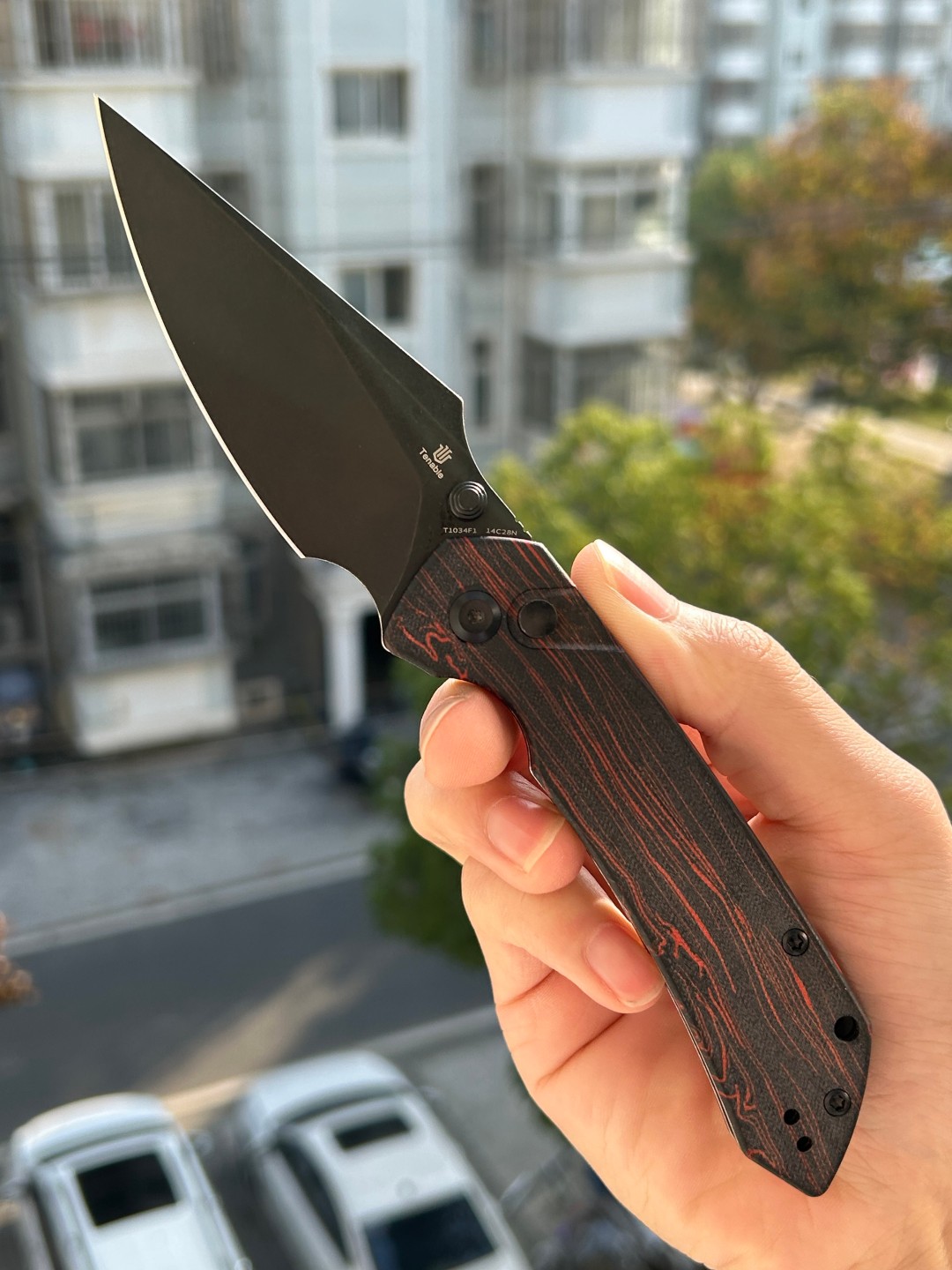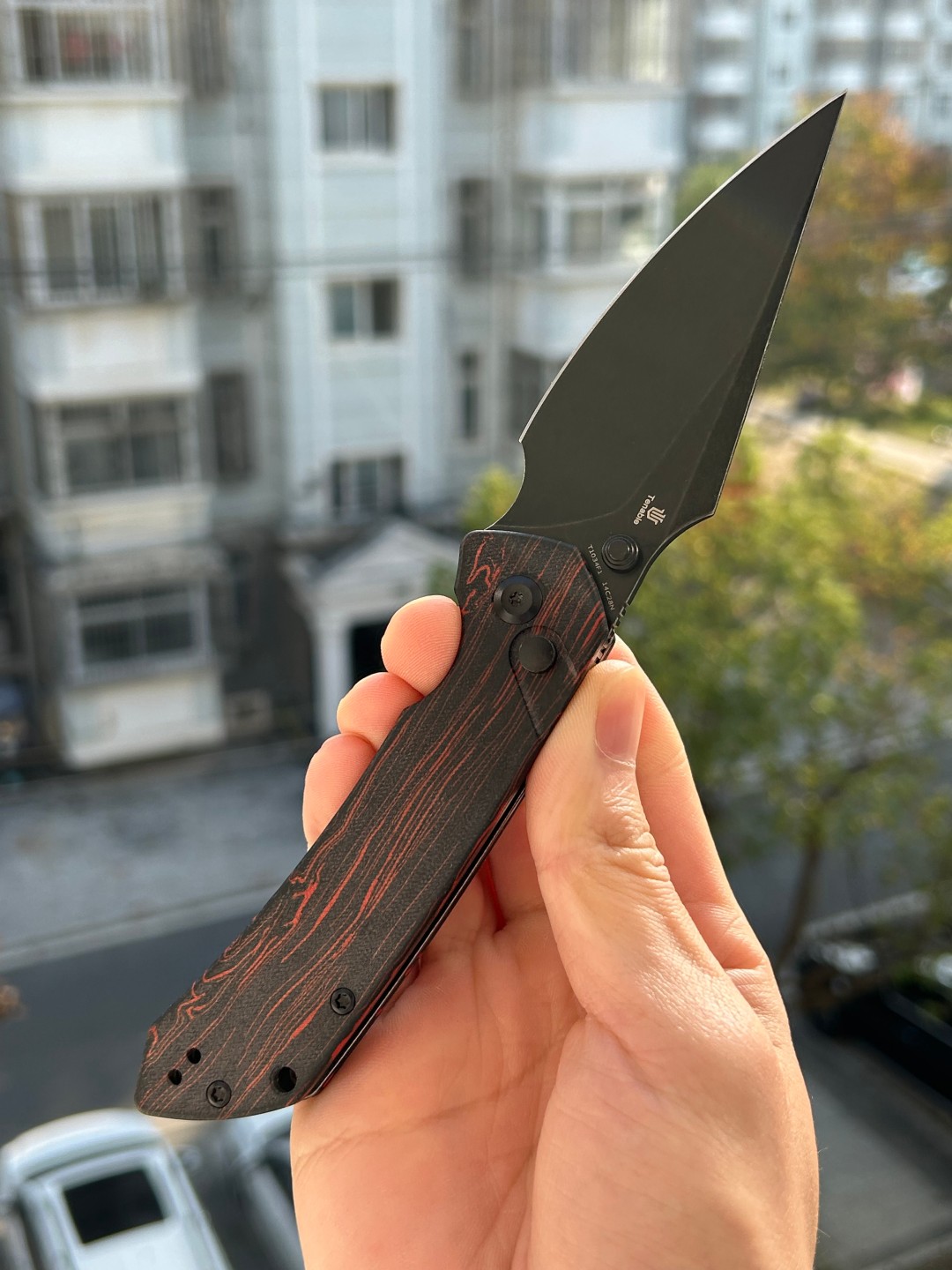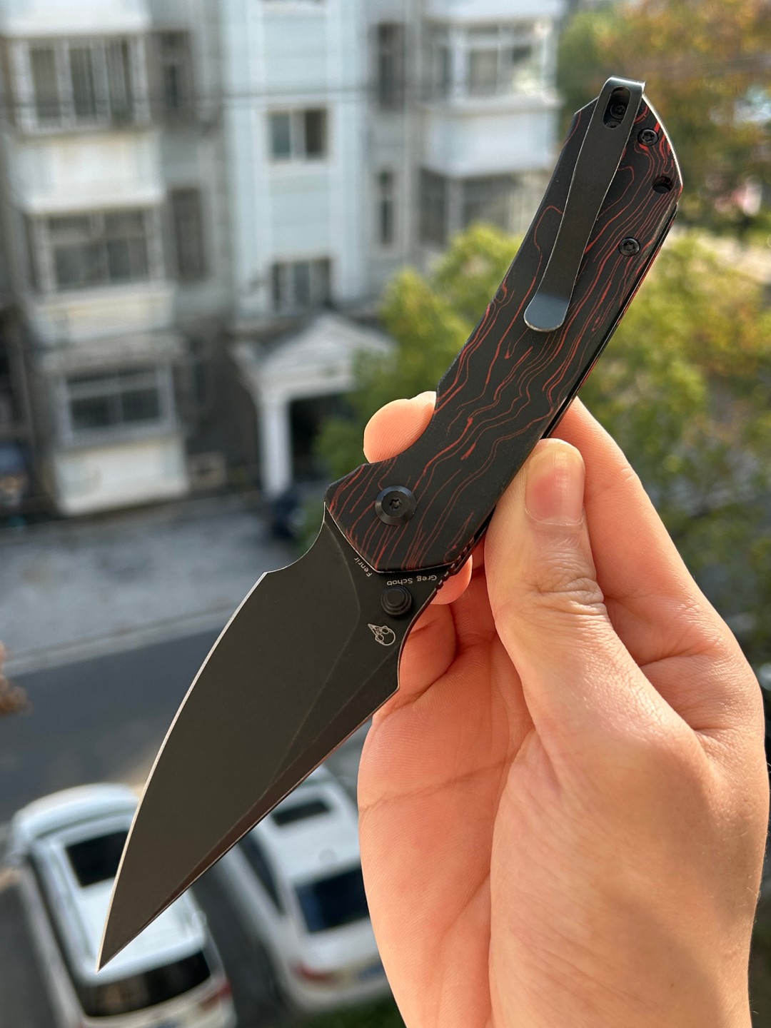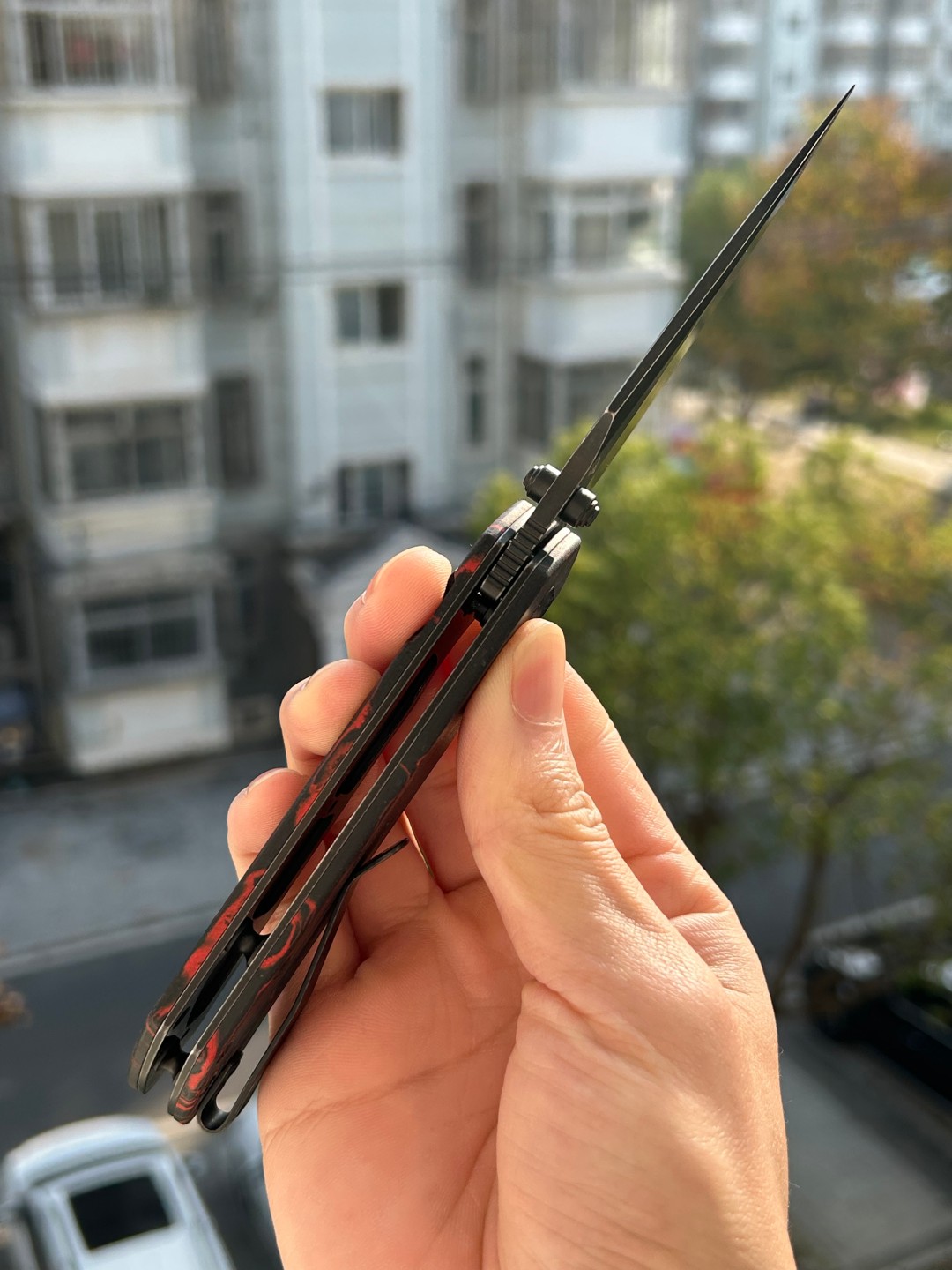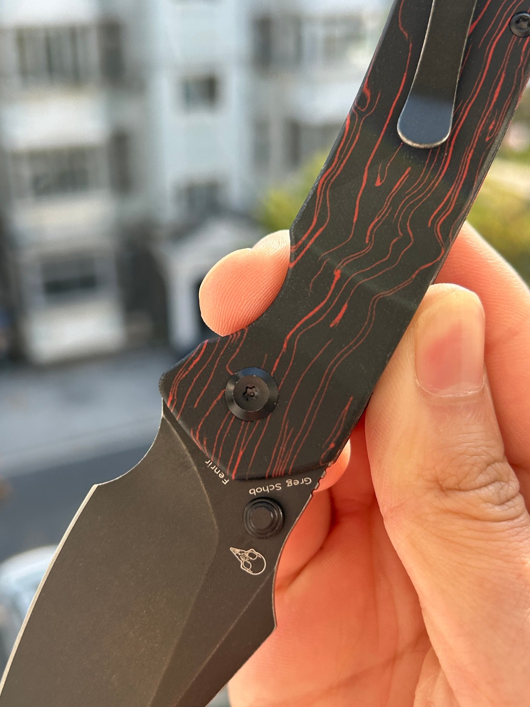手柄采用带倒角边缘的铝制手柄,提供舒适和安全的握持。Frag 图案纹理增强了牵引力,在不影响舒适度的情况下提高了抓地力。这种设计确保刀手感极佳,既稳定又提供流畅、符合人体工程学的体验,适合长时间使用。