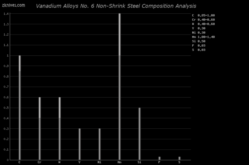 No. 6 Non-Shrink(Vanadium Alloys) - 一种常见的锻造钢材。被许多定制刀具制造商和批量生产商使用,包括Randall。具有良好的刃口稳定性和耐磨性,虽然韧性不如AISI A2或其等效材料,但在这一方面仍然表现不错。可以达到65HRC的硬度,适合作为轻型/中型切割工具的精细刃口。Randall通常将其硬度控制在56HRC左右,而其他制造商在制作较大刀具时通常将其硬度控制在56-58HRC,对于中小型刀具则会更高。如果你需要一把高强度使用的刀具,Crucible CPM 3V、AISI L6或AISI A2及其等效材料会是更好的选择。对于小型刀具,No. 6 Non-Shrink在高硬度下表现更佳。