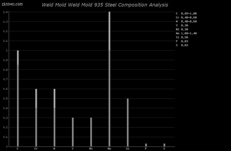 Weld Mold 935(Weld Mold) - 一种常见的锻造钢材。被许多定制刀具制造商和批量生产商使用,包括Randall。具有良好的刃口稳定性和耐磨性,虽然韧性不如AISI A2或其等效材料,但在这一方面仍然表现不错。可以达到65HRC的硬度,适合作为轻型/中型切割工具的精细刃口。Randall通常将其硬度控制在56HRC左右,而其他制造商在制作较大刀具时通常将其硬度控制在56-58HRC,对于中小型刀具则会更高。如果你需要一把高强度使用的刀具,Crucible CPM 3V、AISI L6或AISI A2及其等效材料会是更好的选择。对于小型刀具,Weld Mold 935在高硬度下表现更佳。