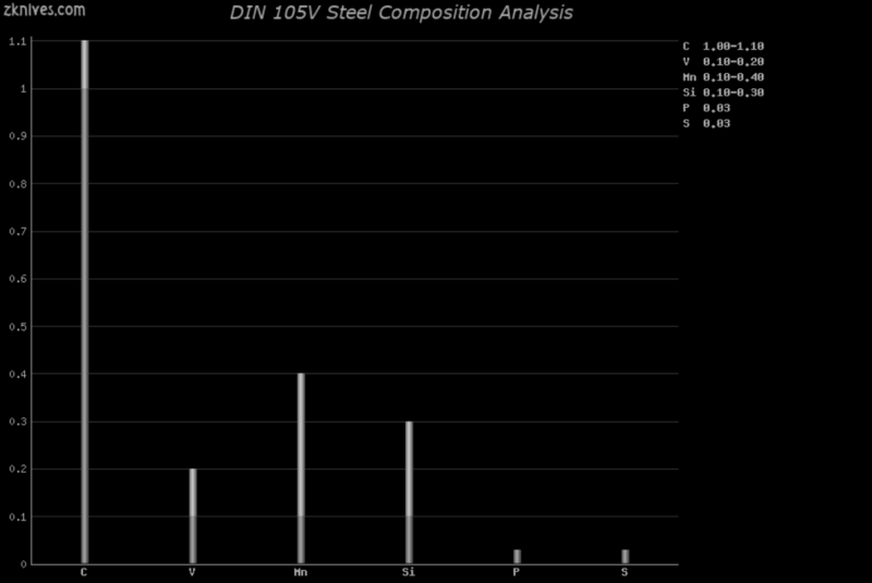 105V(DIN) - 合金冷作工具钢。存在微量的钒,有助于晶粒细化。除此之外,没什么可说的,超过 1% 的碳,仅此而已。比 AISI 1095 系列有所改进,但幅度不大。