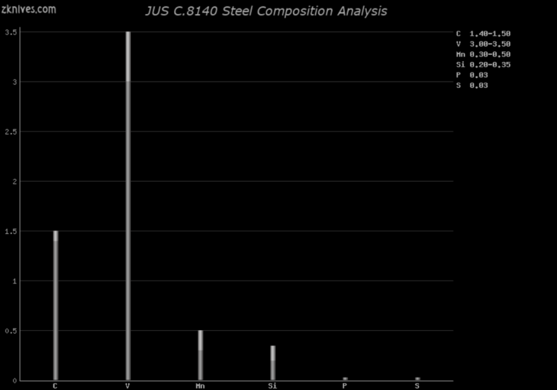 C.8140(JUS) - 一种水淬合金工具钢。碳含量较高,达到1.5%,同时含有3%的钒,钒是极佳的碳化物形成元素,并能细化钢的晶粒。能够形成非常精细的刃口,具有较好的刃口保持性和耐磨性。虽然未见于量产刀具中,但在一些定制刀具中有所使用。