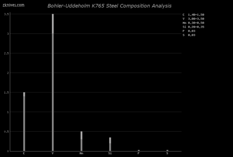 K765(Bohler-Uddeholm) - 一种水淬合金工具钢。碳含量较高,达到1.5%,同时含有3%的钒,钒是极佳的碳化物形成元素,并能细化钢的晶粒。能够形成非常精细的刃口,具有较好的刃口保持性和耐磨性。虽然未见于量产刀具中,但在一些定制刀具中有所使用。