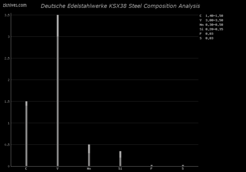 KSX38(Deutsche Edelstahlwerke) - 一种水淬合金工具钢。碳含量较高,达到1.5%,同时含有3%的钒,钒是极佳的碳化物形成元素,并能细化钢的晶粒。能够形成非常精细的刃口,具有较好的刃口保持性和耐磨性。虽然未见于量产刀具中,但在一些定制刀具中有所使用。