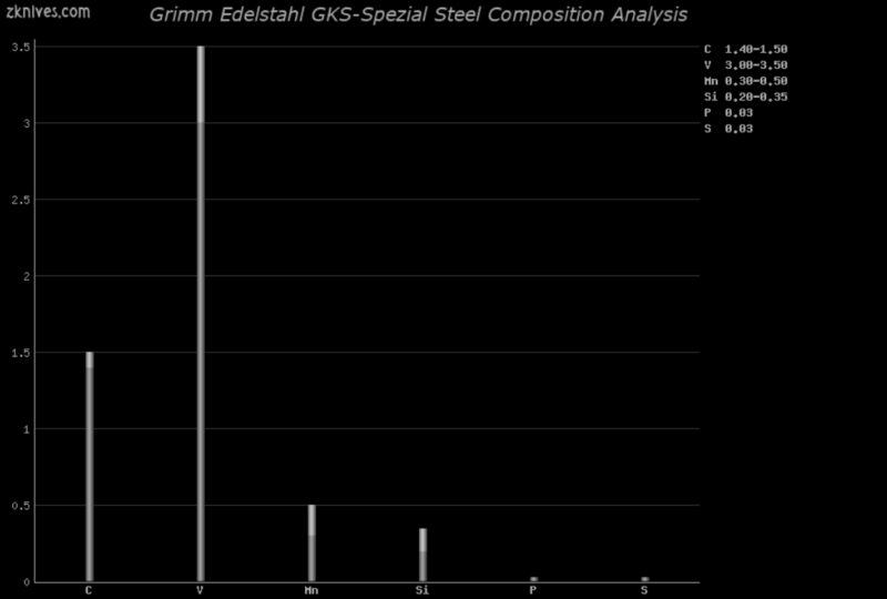 GKS-Spezial(Grimm Edelstahl) - 一种水淬合金工具钢。碳含量较高,达到1.5%,同时含有3%的钒,钒是极佳的碳化物形成元素,并能细化钢的晶粒。能够形成非常精细的刃口,具有较好的刃口保持性和耐磨性。虽然未见于量产刀具中,但在一些定制刀具中有所使用。