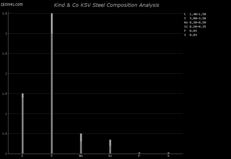 KSV(Kind & Co) - 一种水淬合金工具钢。碳含量较高,达到1.5%,同时含有3%的钒,钒是极佳的碳化物形成元素,并能细化钢的晶粒。能够形成非常精细的刃口,具有较好的刃口保持性和耐磨性。虽然未见于量产刀具中,但在一些定制刀具中有所使用。