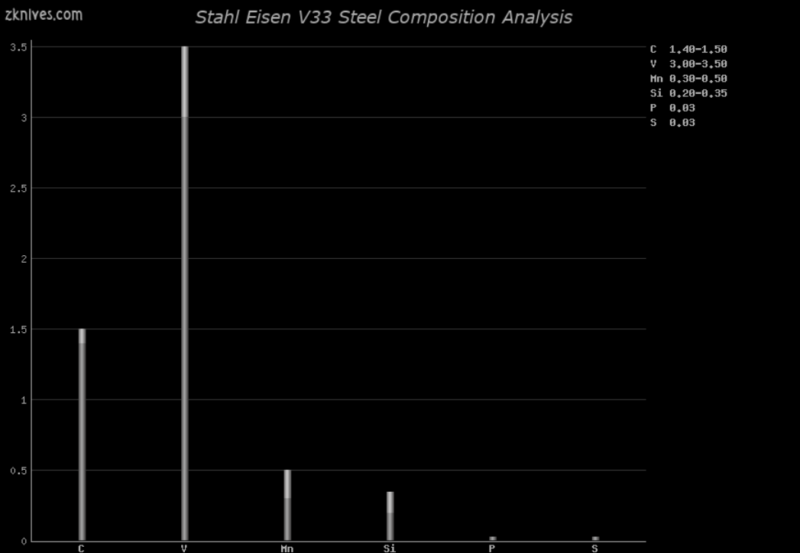 V33(Stahl Eisen) - 一种水淬合金工具钢。碳含量较高,达到1.5%,同时含有3%的钒,钒是极佳的碳化物形成元素,并能细化钢的晶粒。能够形成非常精细的刃口,具有较好的刃口保持性和耐磨性。虽然未见于量产刀具中,但在一些定制刀具中有所使用。