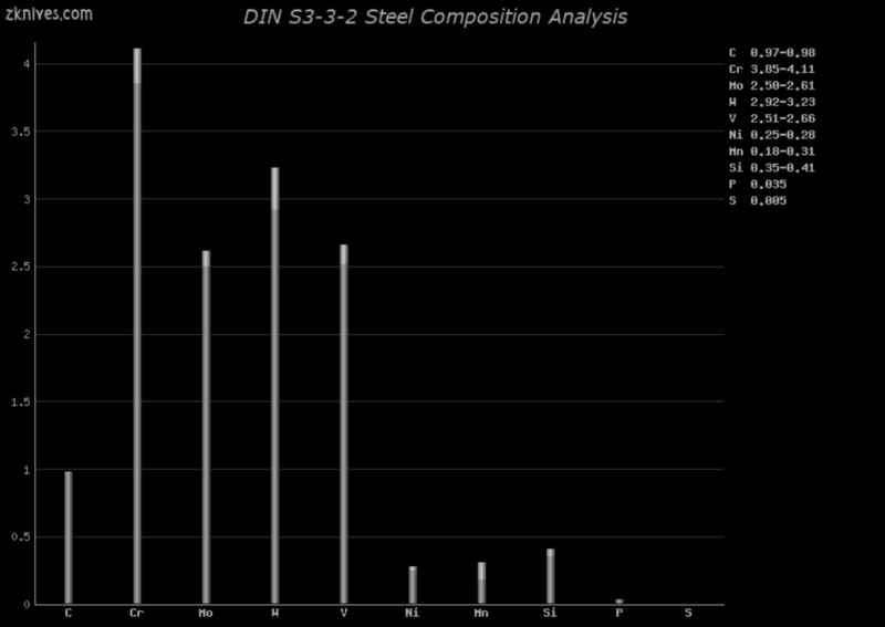 碳(C):0.97%-0.98% 铬(Cr):3.85%-4.11% 钼(Mo):2.50%-2.61% 钨(W):2.92%-3.23% 钒(V):2.51%-2.66% 镍(Ni):0.25%-0.28% 锰(Mn):0.18%-0.31% 硅(Si):0.35%-0.41% 磷(P):0.035% 硫(S):0.005%