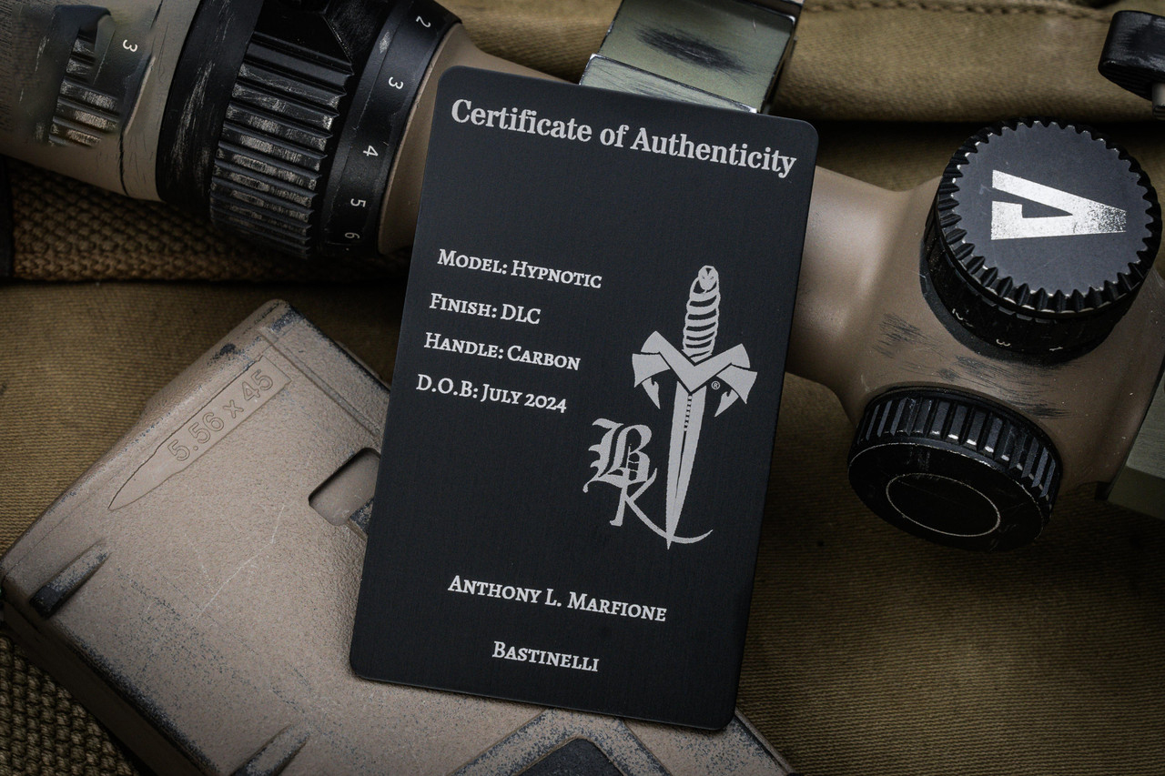 Tony Marfione 的手磨,Bastien Coves 整体:6 英寸 刀片:4.5' M390 DLC Stonewash 手柄: 碳纤维 重量: 3 盎司 定制防水硬壳 出生日期: 7/2024 Marfione Custom/Bastinelli 刀具合作