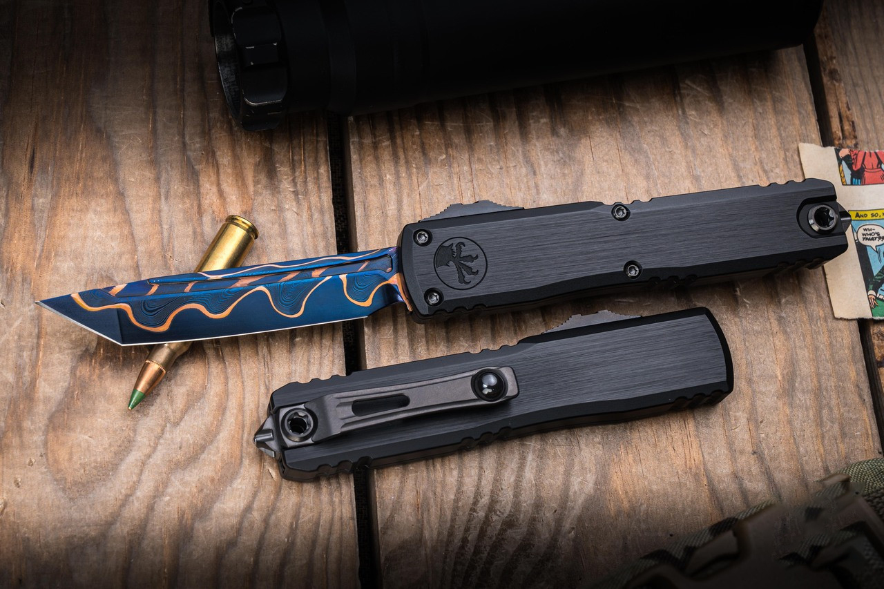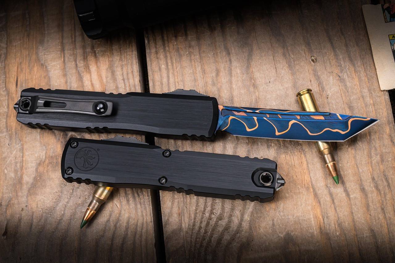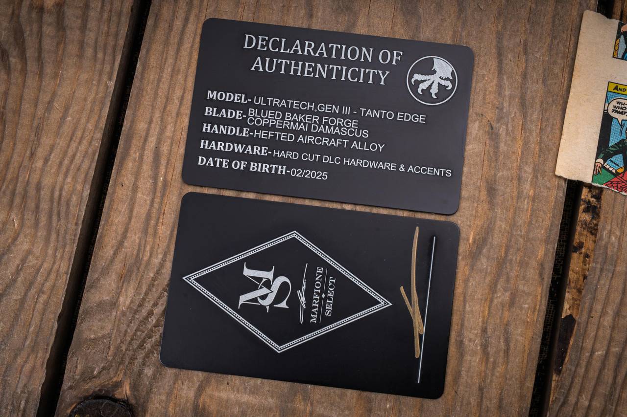 总长度: 8.5” 刀片:3.5 英寸 Tanto,蓝钢 Baker Forge 铜 Mai Damascus 手柄:5 英寸重型合金 DLC 口袋夹:倾斜向下,左/右携带 打开器:Thumb Slider 类型:OTF(前部出)自动,双动 ...