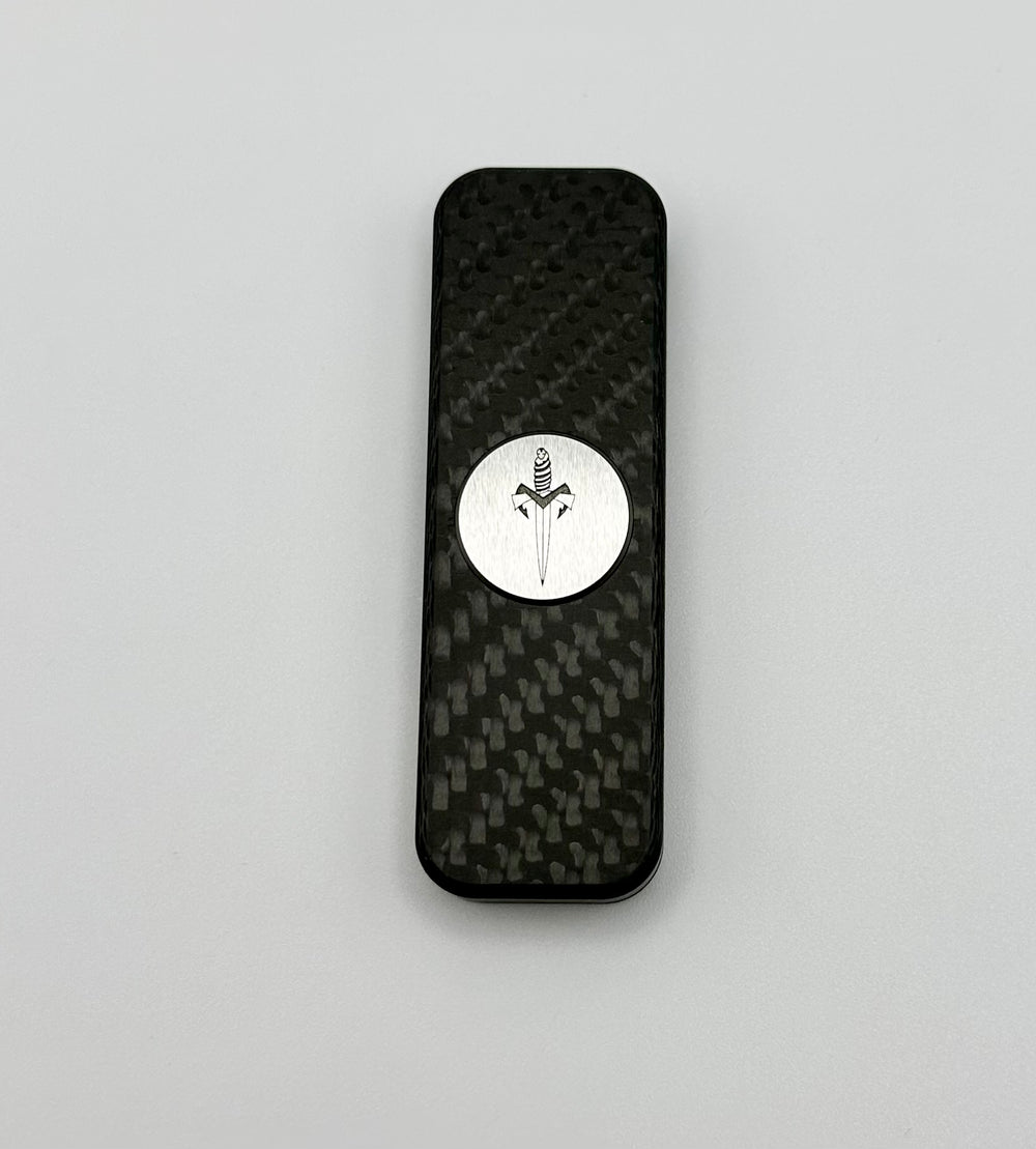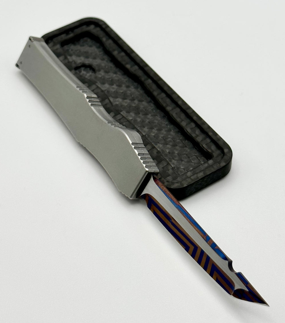 这是一款来自 Marfione Custom Knives 的精美手工制作的 Mini Halo 3。它采用蓝色马赛克大马士革双色完成星形研磨 Tanto 刀片,配有 416 不锈钢双色手柄。黑色唇形珍珠镶嵌在按钮和充电手柄底部,带有双蒸汽喷射硬件。它还配备了一个碳纤维外壳,与所有标准 Marfione Customs Packaging 一起显示。