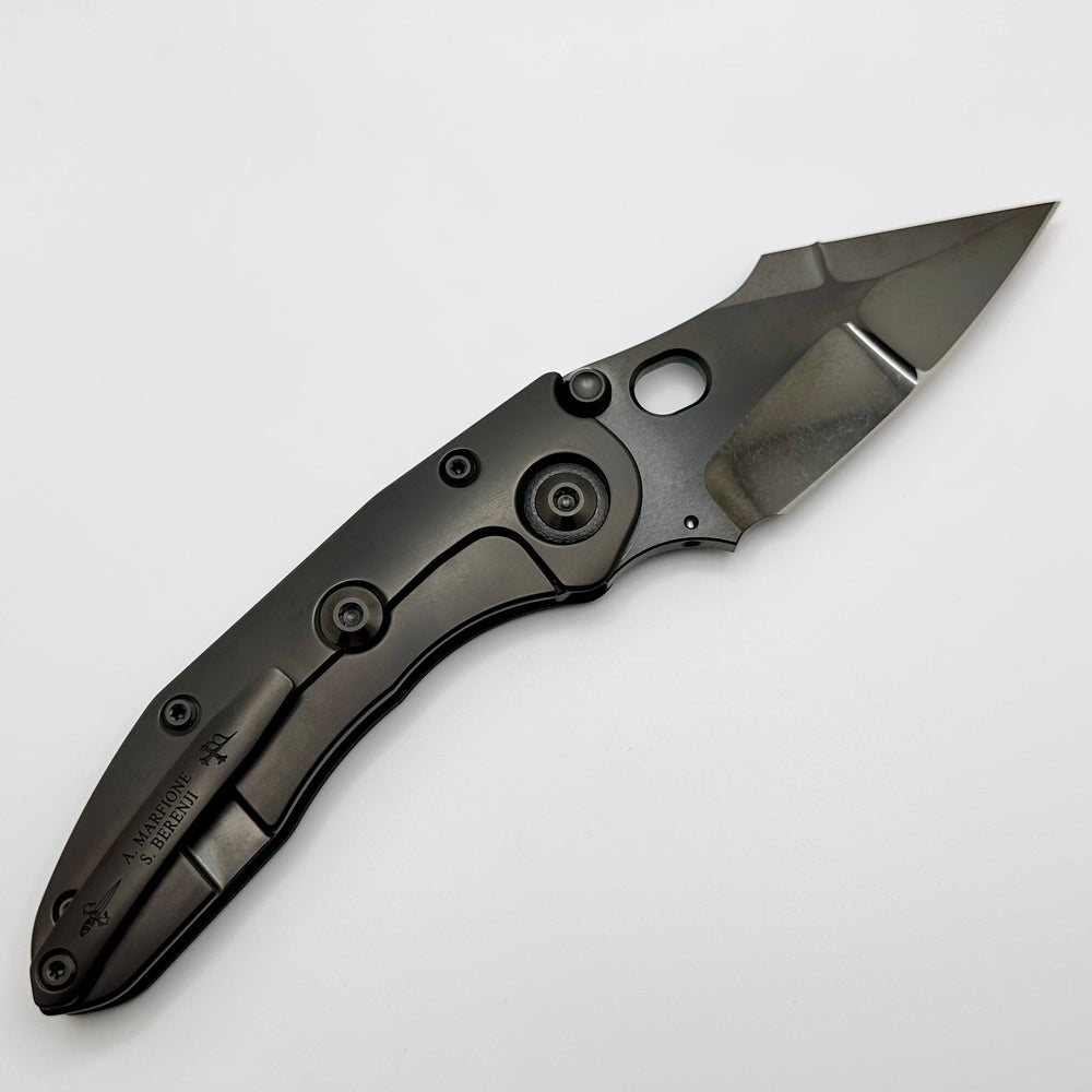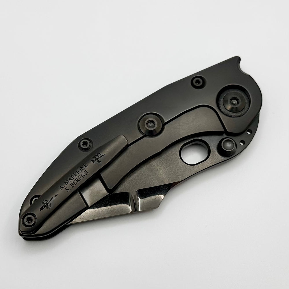 描述 这是来自Marfione定制刀具和Borka刀片的美丽定制针法。 它具有 Cracked DLC Diamondwash Double Star Grind Blade 和 Blackout Frag Carbon Fiber/DLC 手柄。它的背带和刀片中还有 6 个 Blue Tri...
