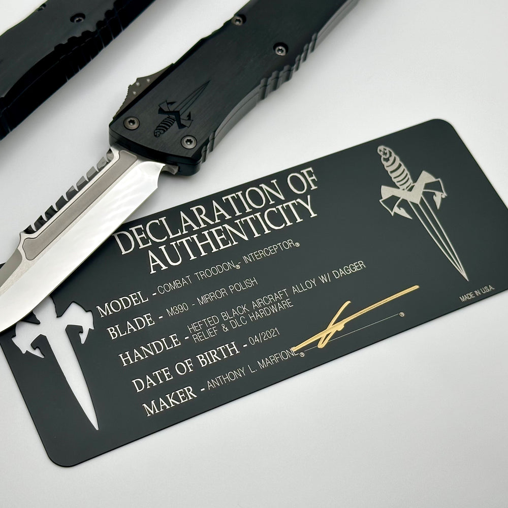 这款美丽的 Marfione Combat Troodon 具有带有 DLC 硬件的 Hefted 黑色飞机合金手柄。它还有一个手工抛光的 M390 Interceptor 刀片。