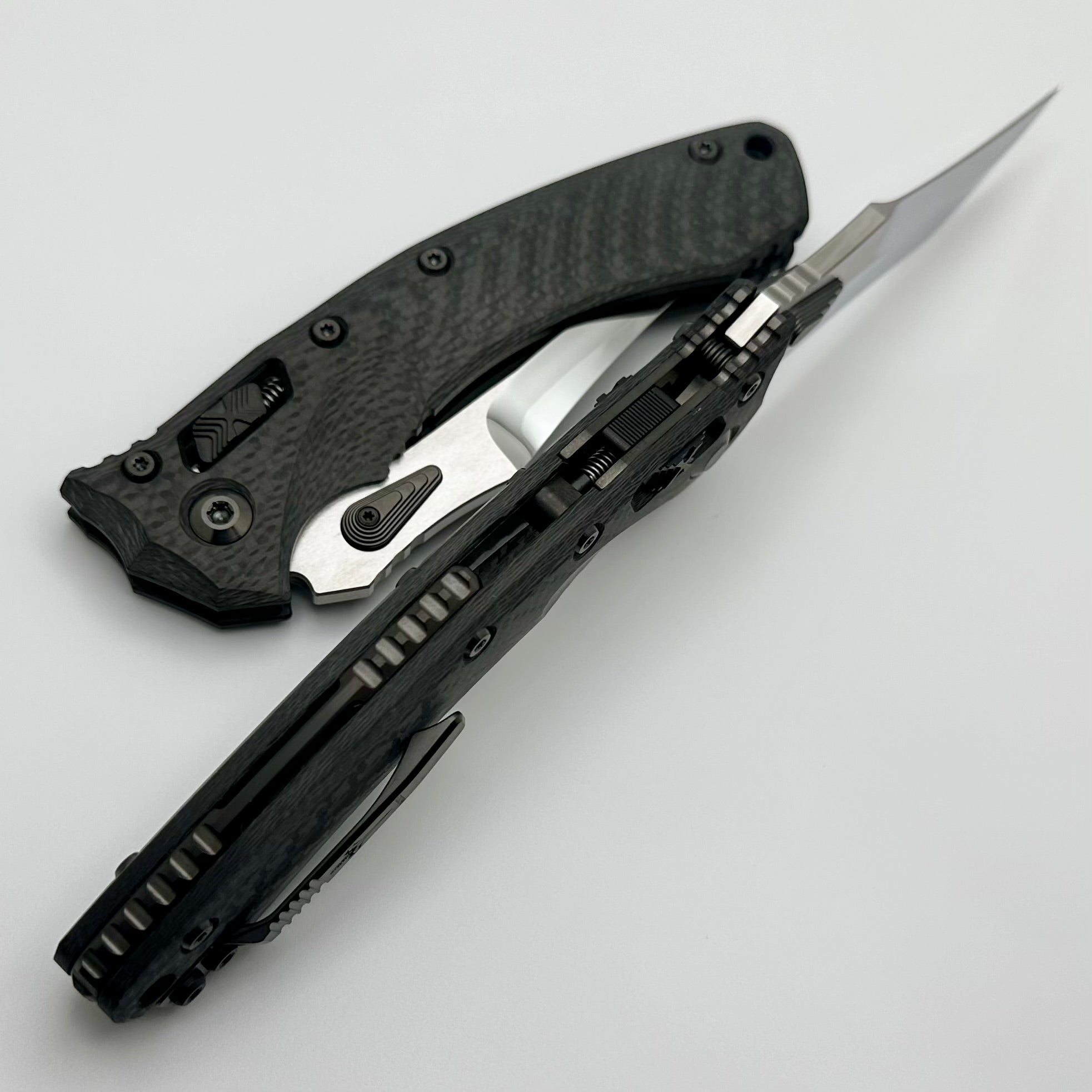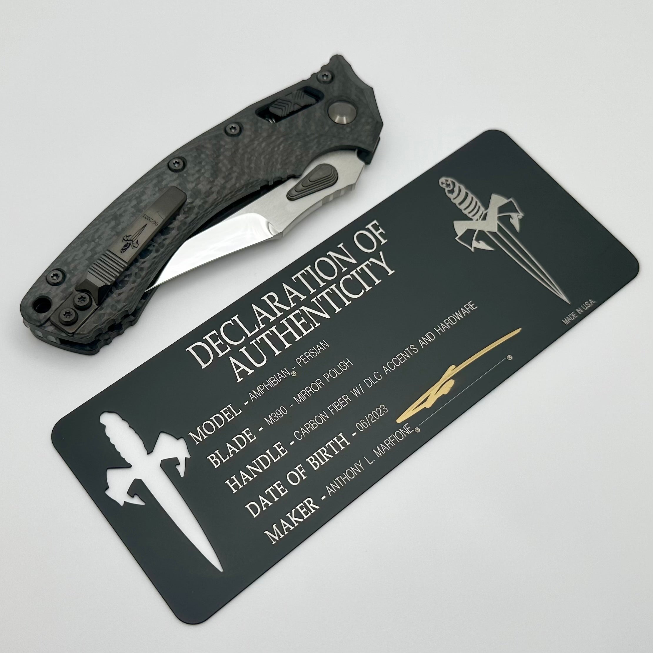 这是一只美丽的 Marfione 定制两栖波斯犬。它的特点是 M390 制成的刀片,镜面抛光处理,碳纤维手柄和 DLC 双色硬件。它包括一个 Marfione 定制盒、布料、签名的金属 COA、金属贴片、毛绒袋和拉链拉头!