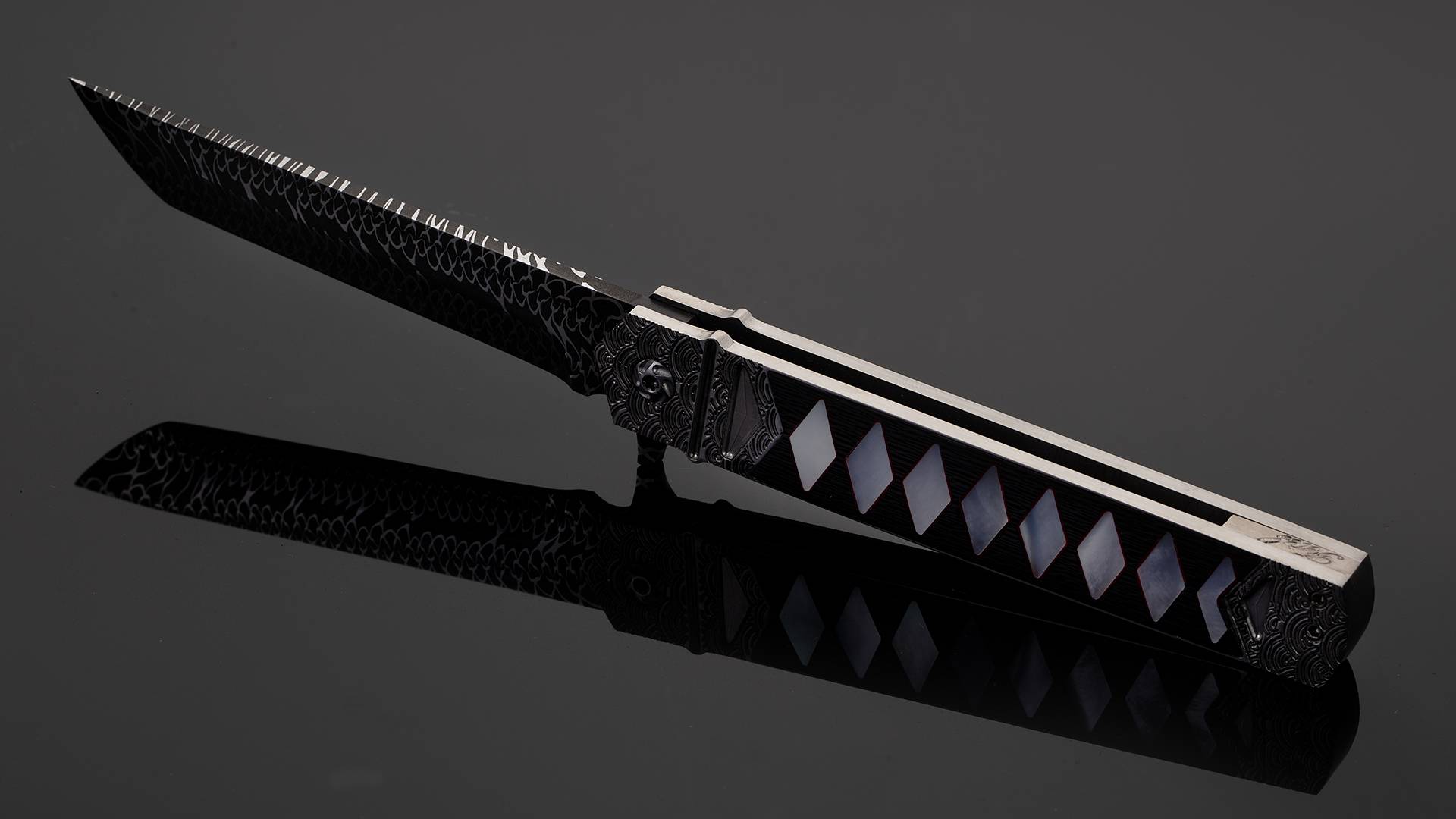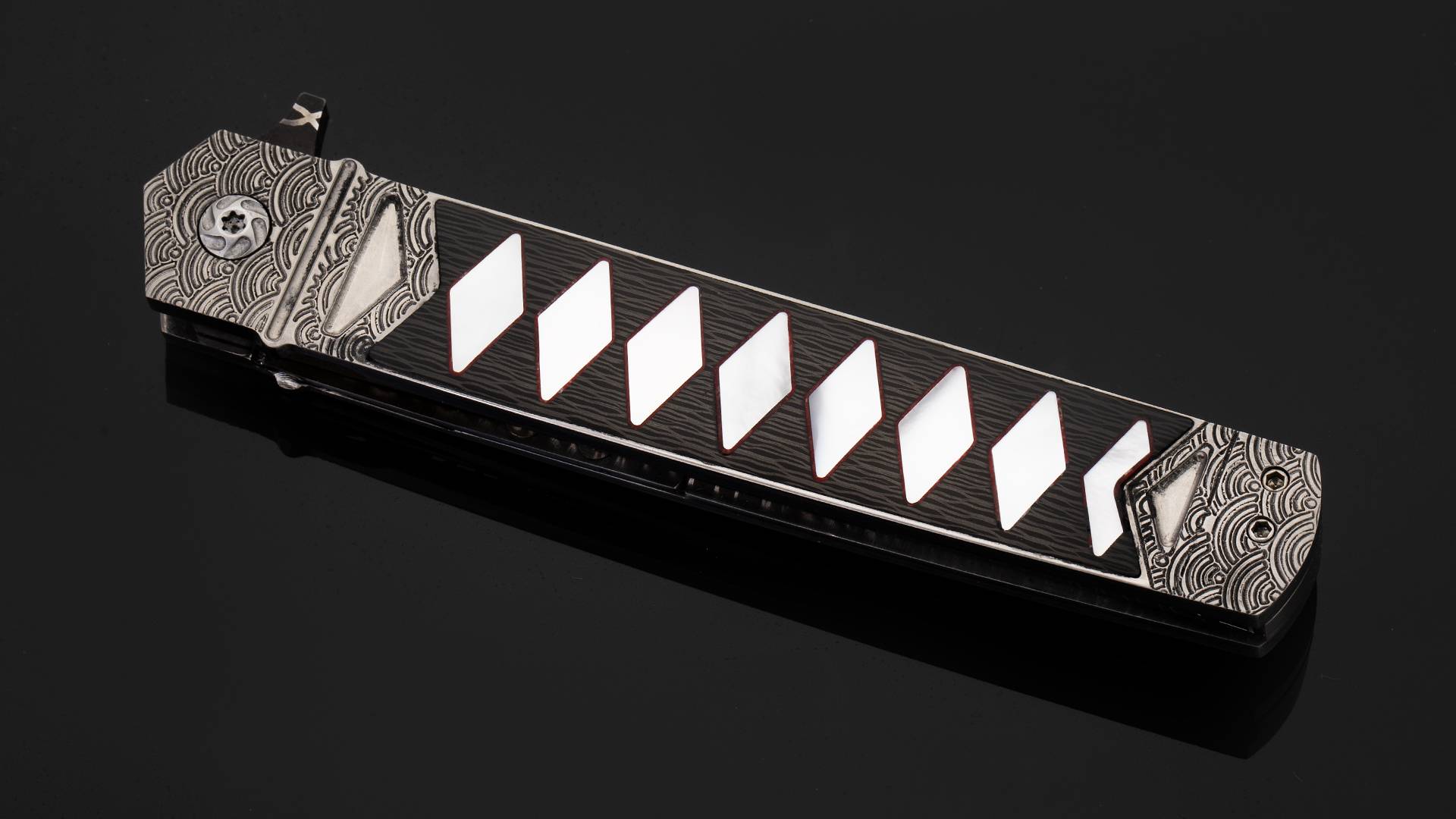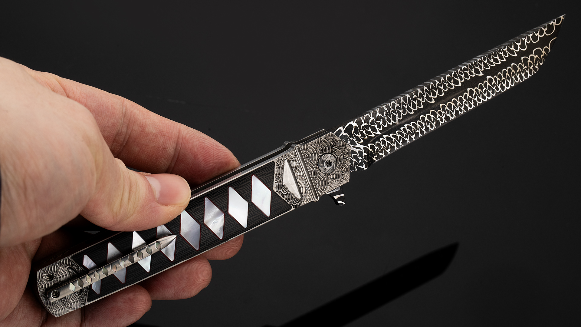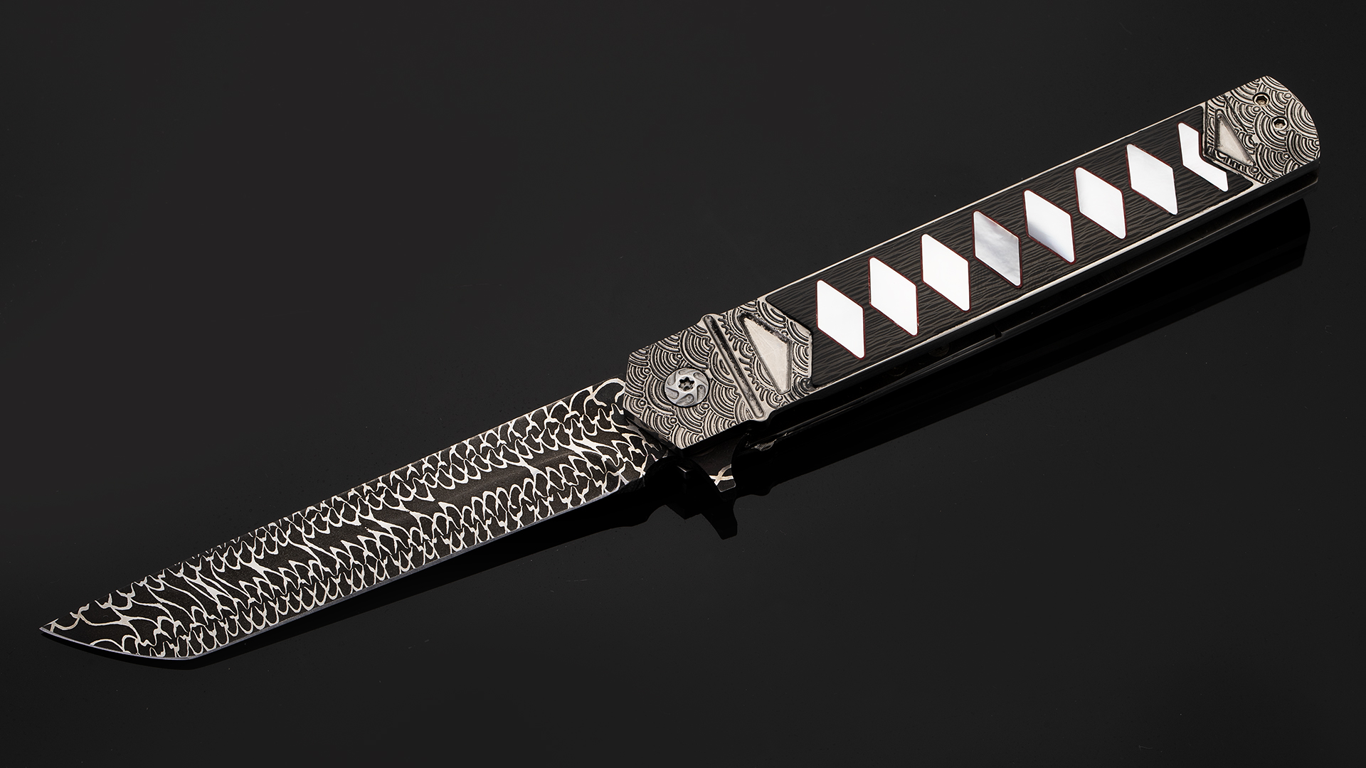 此件作品全长21.3厘米,刃长9.5厘米,裸重86克。刀刃采用云纹大马士革制作而成,花纹动感对比强烈,如同祥云气势如虹。刀柄采用钛合金制作框架,并雕刻了精美的海浪纹理。刀柄中心则镶嵌了碳钎维以及珍珠贝母组合而成的传统日本刀柄卷造型,非常别致。刀柄还带有一枚醒目的背夹,背夹上也镶嵌了深海黑贝母。此件作品绝对是艺术与战术折刀结合的优秀案例,让人爱不释手。