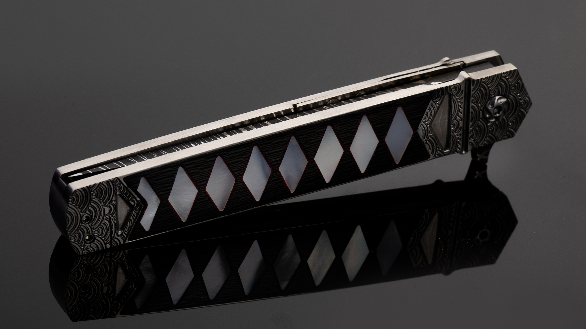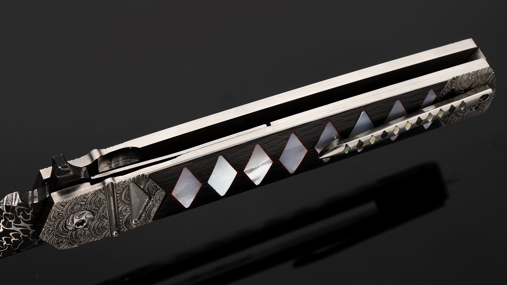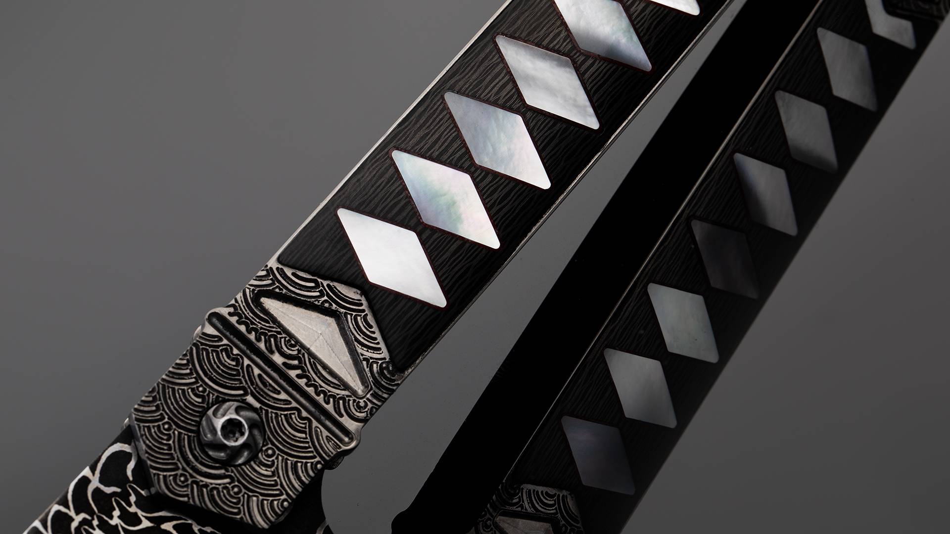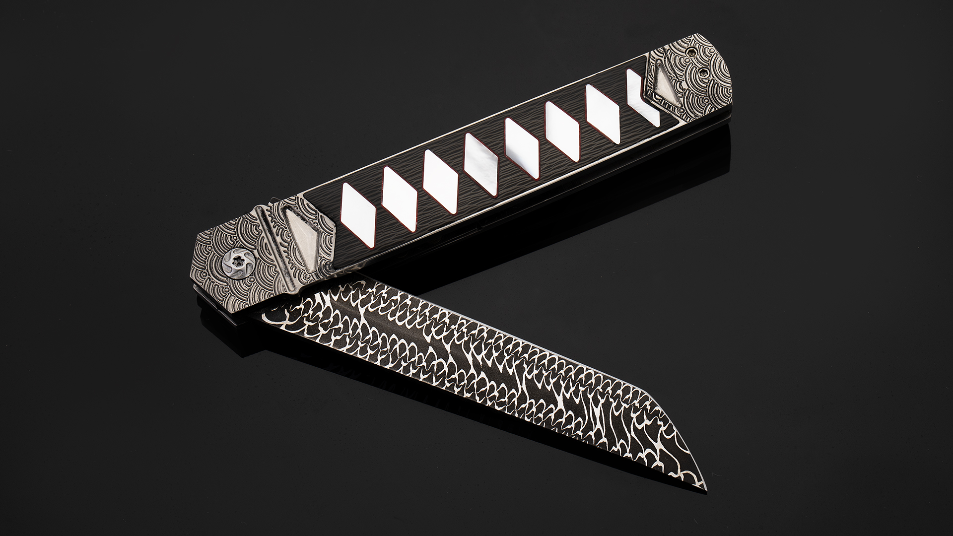 此件作品全长21.3厘米,刃长9.5厘米,裸重86克。刀刃采用云纹大马士革制作而成,花纹动感对比强烈,如同祥云气势如虹。刀柄采用钛合金制作框架,并雕刻了精美的海浪纹理。刀柄中心则镶嵌了碳钎维以及珍珠贝母组合而成的传统日本刀柄卷造型,非常别致。刀柄还带有一枚醒目的背夹,背夹上也镶嵌了深海黑贝母。此件作品绝对是艺术与战术折刀结合的优秀案例,让人爱不释手。