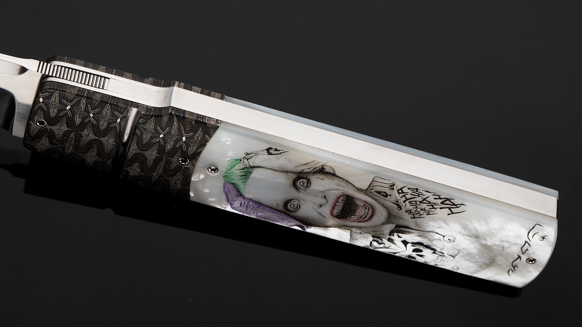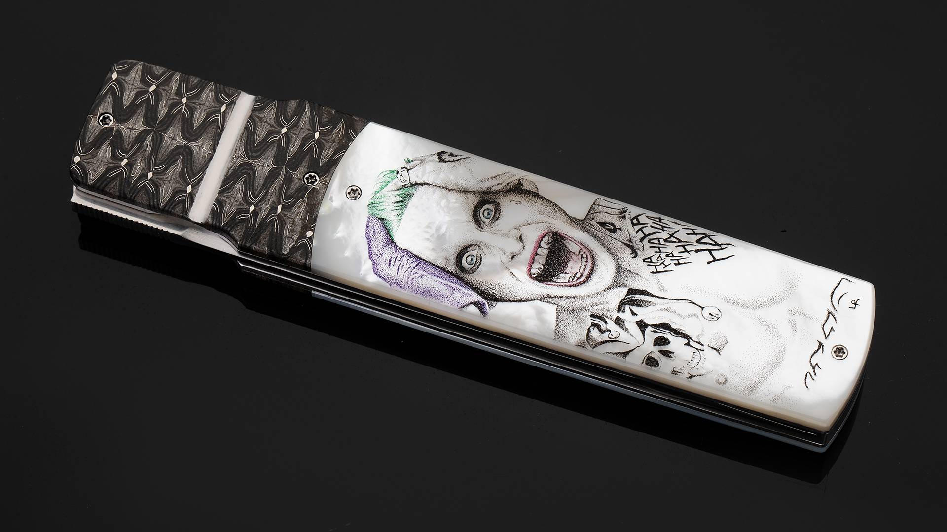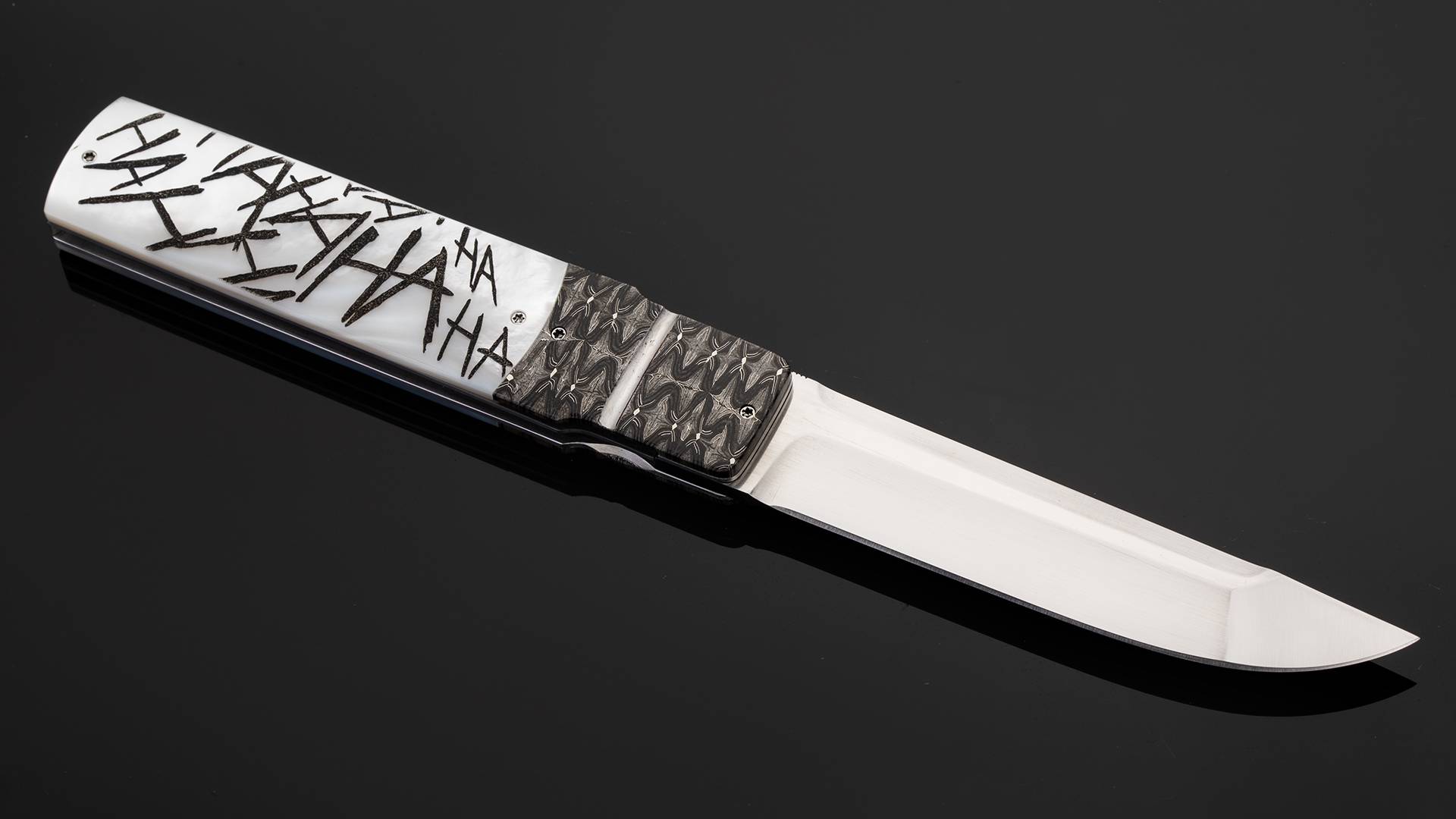 此件作品是一把日式短刀折叠版,与小丑的形象不谋而合。全长23.8厘米,刃长10.2厘米,裸重201克。刀刃采用RWL34不锈钢研磨而成,分段打磨塑造出棱角分明的日式短刀轮廓,加上手工缎面拉丝处理,犀利无比。刀柄护手采用精美大马士革制作而成,大马选择非常出色,花纹与质感如同脑神经的跳动,与癫狂的小丑相当匹配。刀柄采用珍珠贝母制作而成,正面雕刻了细腻的小丑胸像,将变态疯狂的印象刻画得惟妙惟肖,加上贝母半透明的质感,如同小丑对着镜子发出瘆人的狂笑;刀柄另一侧雕刻如同漫画文字风格,hahahahah的狂笑声飞扬跋扈如同正要穿越次元壁,让人过目难忘。此件作品创意优秀,工艺精湛,是一把让男人们流连忘返的优秀折刀作品。