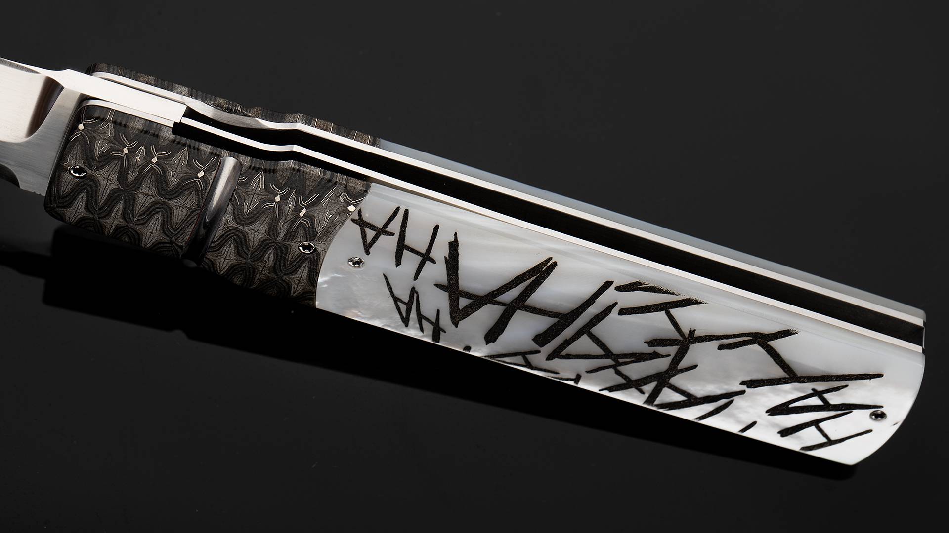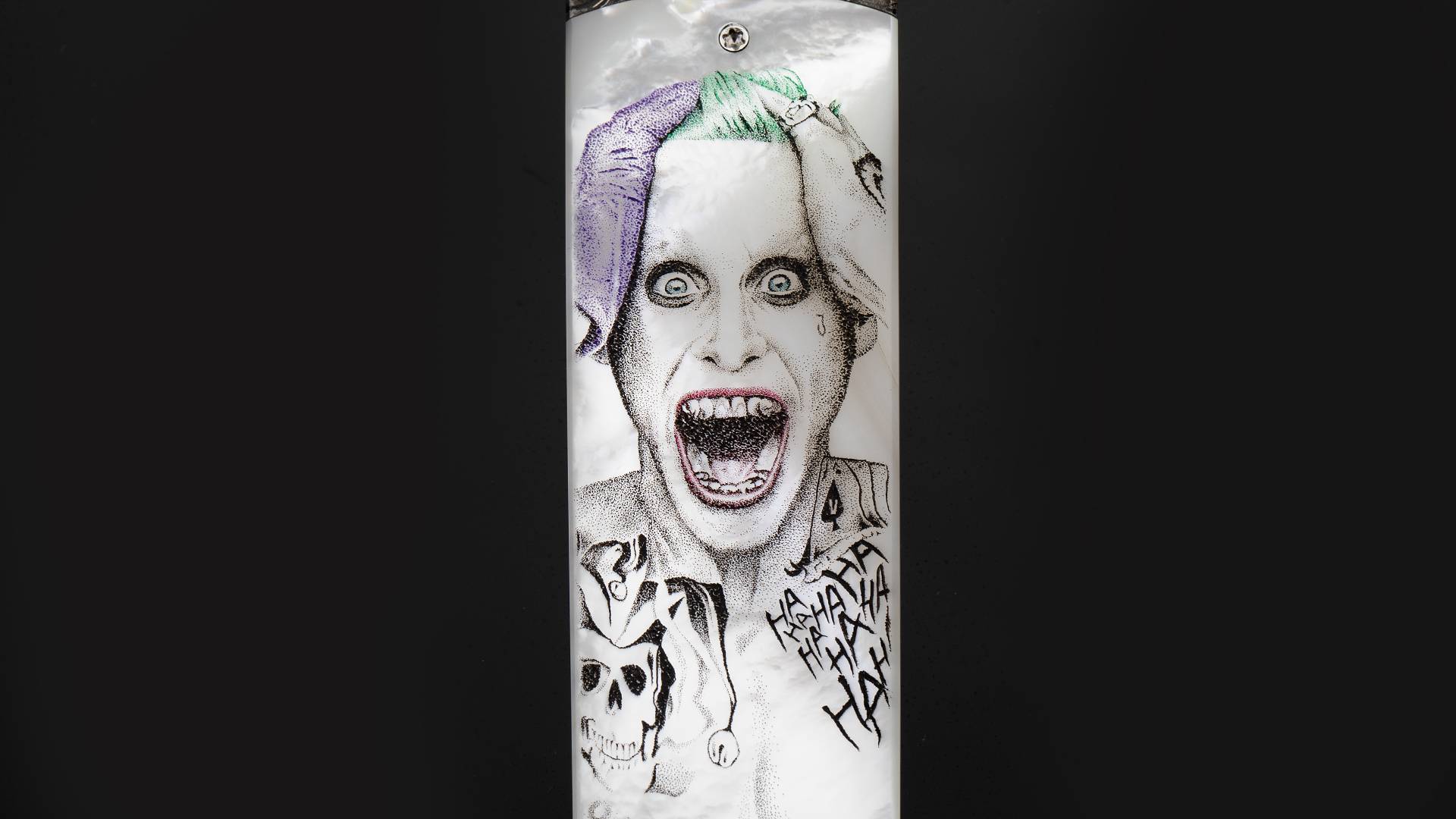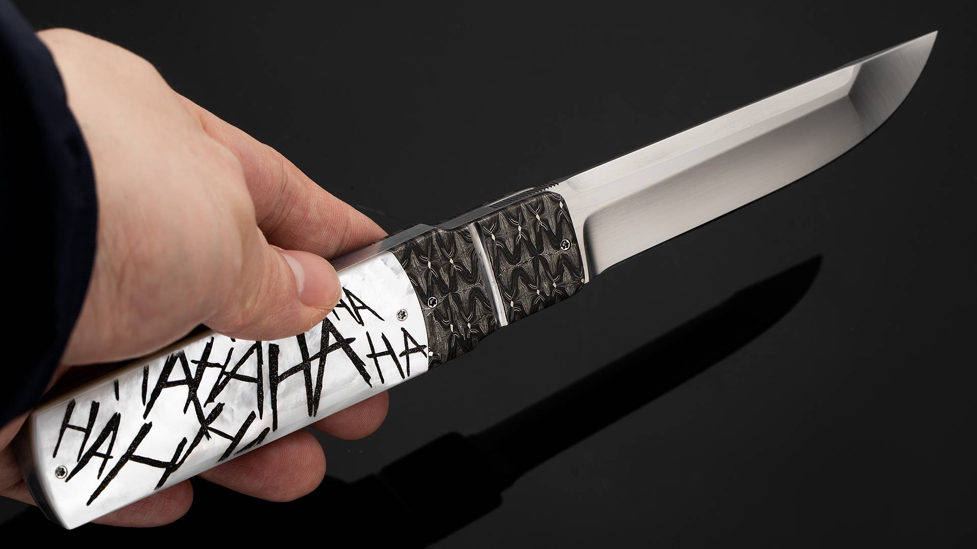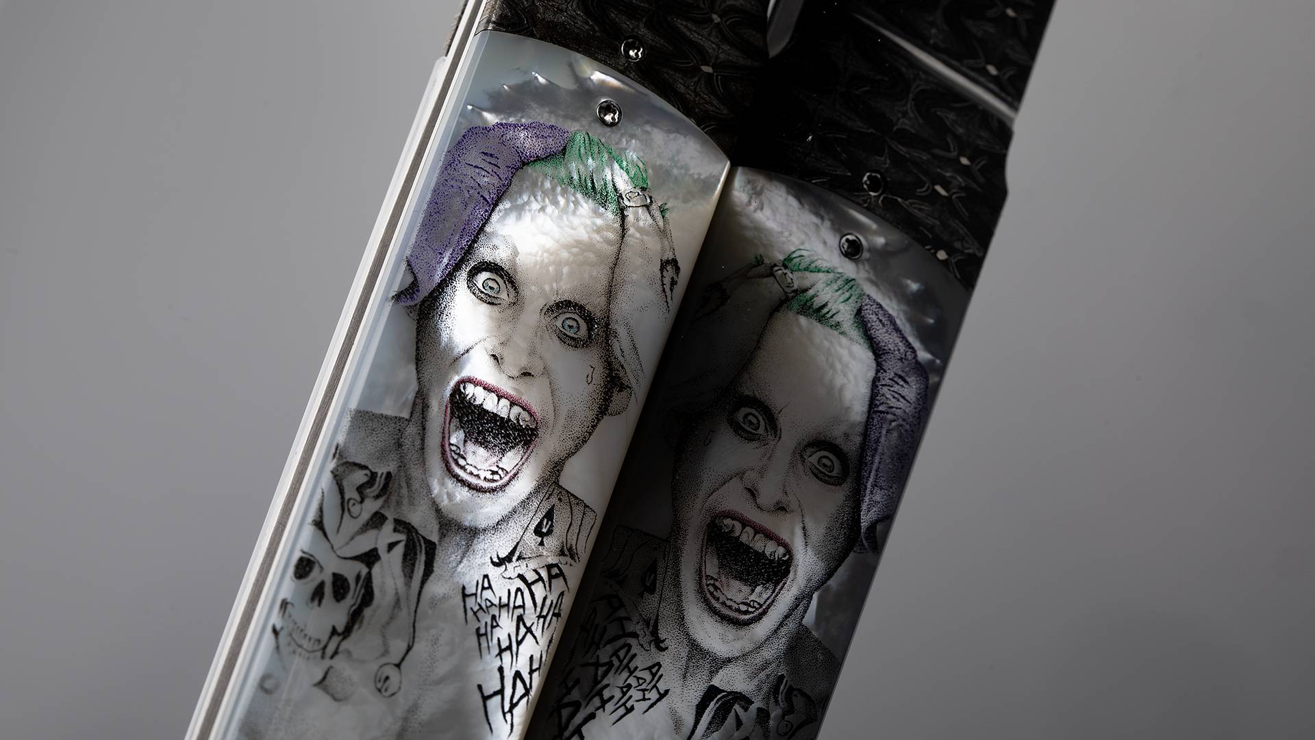 此件作品是一把日式短刀折叠版,与小丑的形象不谋而合。全长23.8厘米,刃长10.2厘米,裸重201克。刀刃采用RWL34不锈钢研磨而成,分段打磨塑造出棱角分明的日式短刀轮廓,加上手工缎面拉丝处理,犀利无比。刀柄护手采用精美大马士革制作而成,大马选择非常出色,花纹与质感如同脑神经的跳动,与癫狂的小丑相当匹配。刀柄采用珍珠贝母制作而成,正面雕刻了细腻的小丑胸像,将变态疯狂的印象刻画得惟妙惟肖,加上贝母半透明的质感,如同小丑对着镜子发出瘆人的狂笑;刀柄另一侧雕刻如同漫画文字风格,hahahahah的狂笑声飞扬跋扈如同正要穿越次元壁,让人过目难忘。此件作品创意优秀,工艺精湛,是一把让男人们流连忘返的优秀折刀作品。