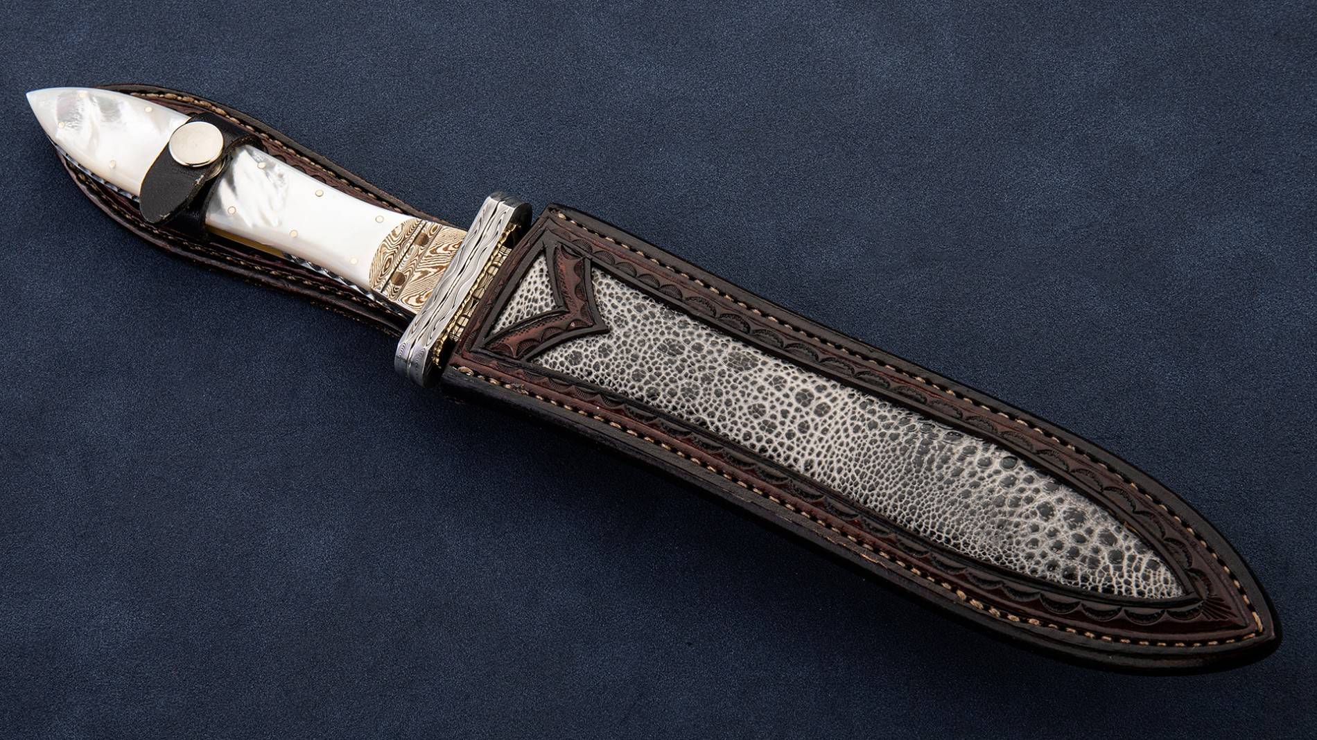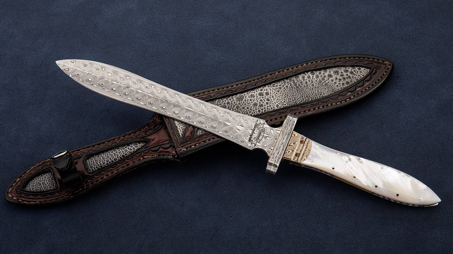 刀柄侧面更是精雕细琢,立体感十足的精美锉花带着大马士革的花纹一同起伏,如同翻滚的波浪。刀柄侧面还镶嵌了金色贝母装饰,刀柄尾部借鉴了亚特坎的耳形刀柄设计,使得刀柄侧面更加立体。精美的剑鞘采用牛皮压花镶嵌蜥蜴皮制作而成,可谓如虎添翼。