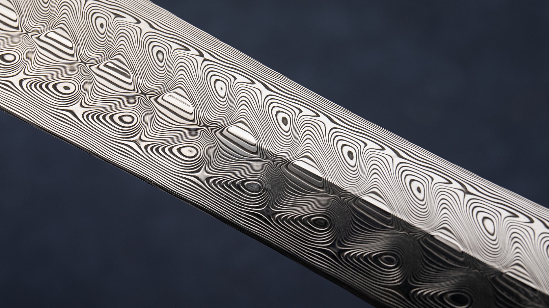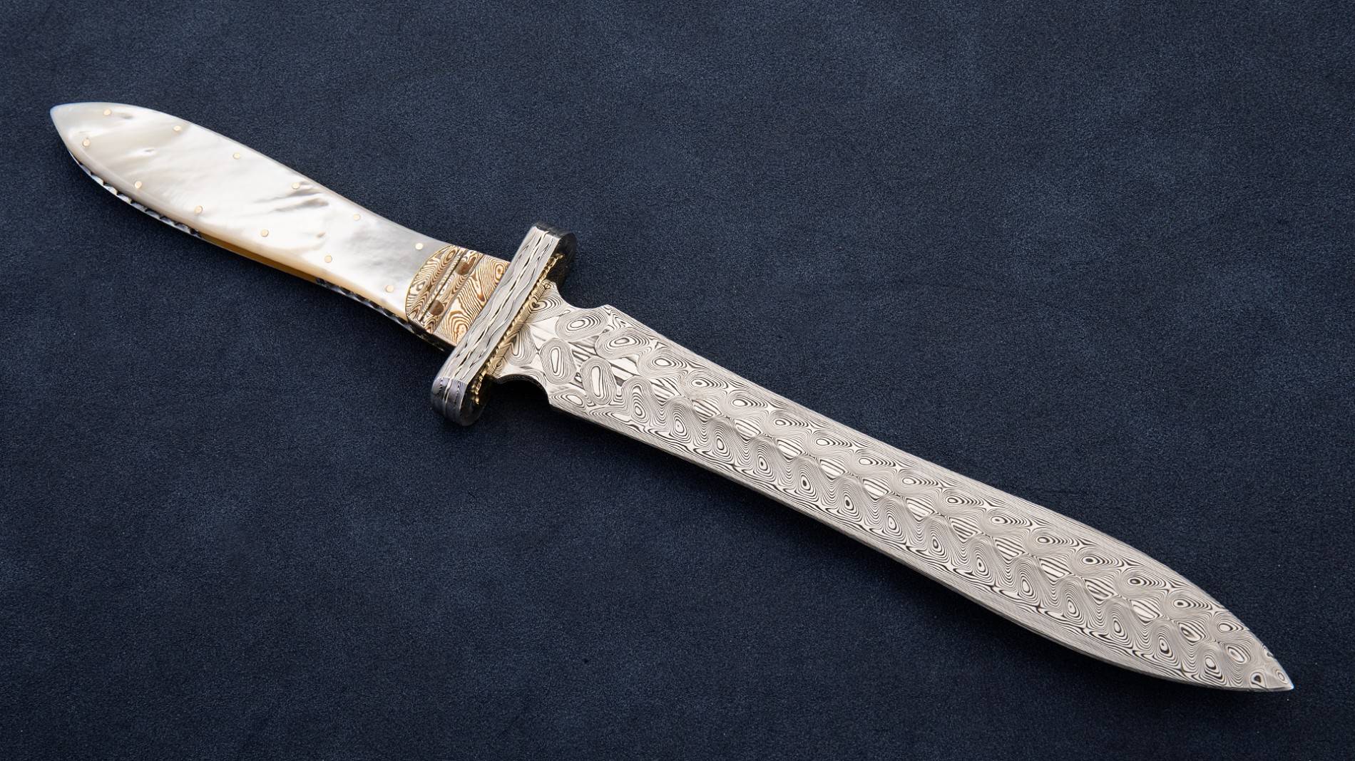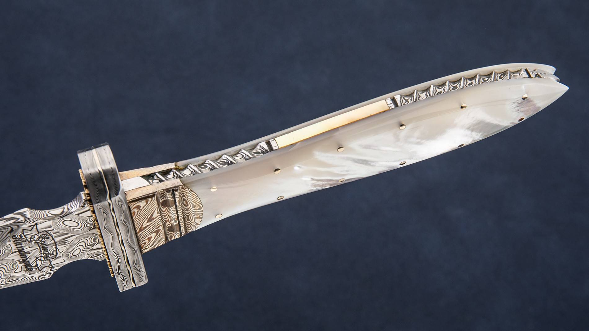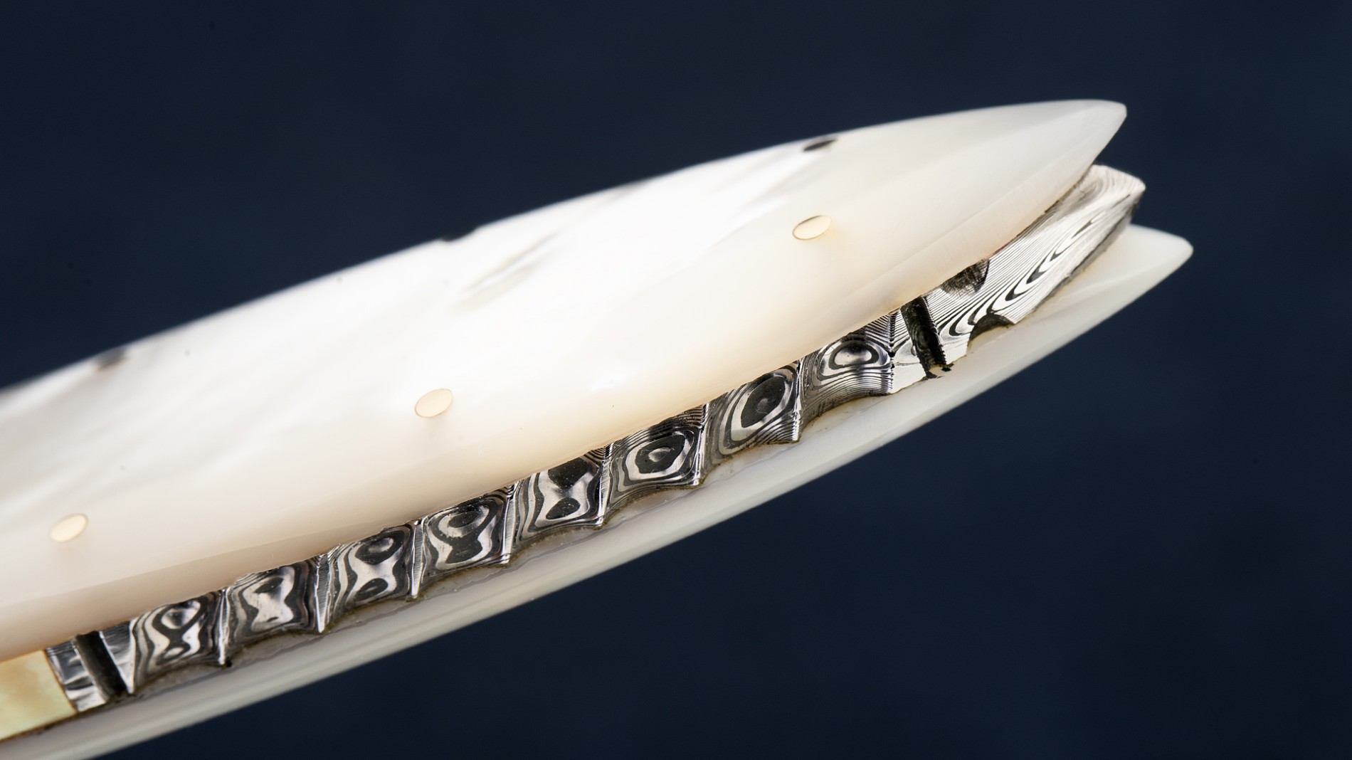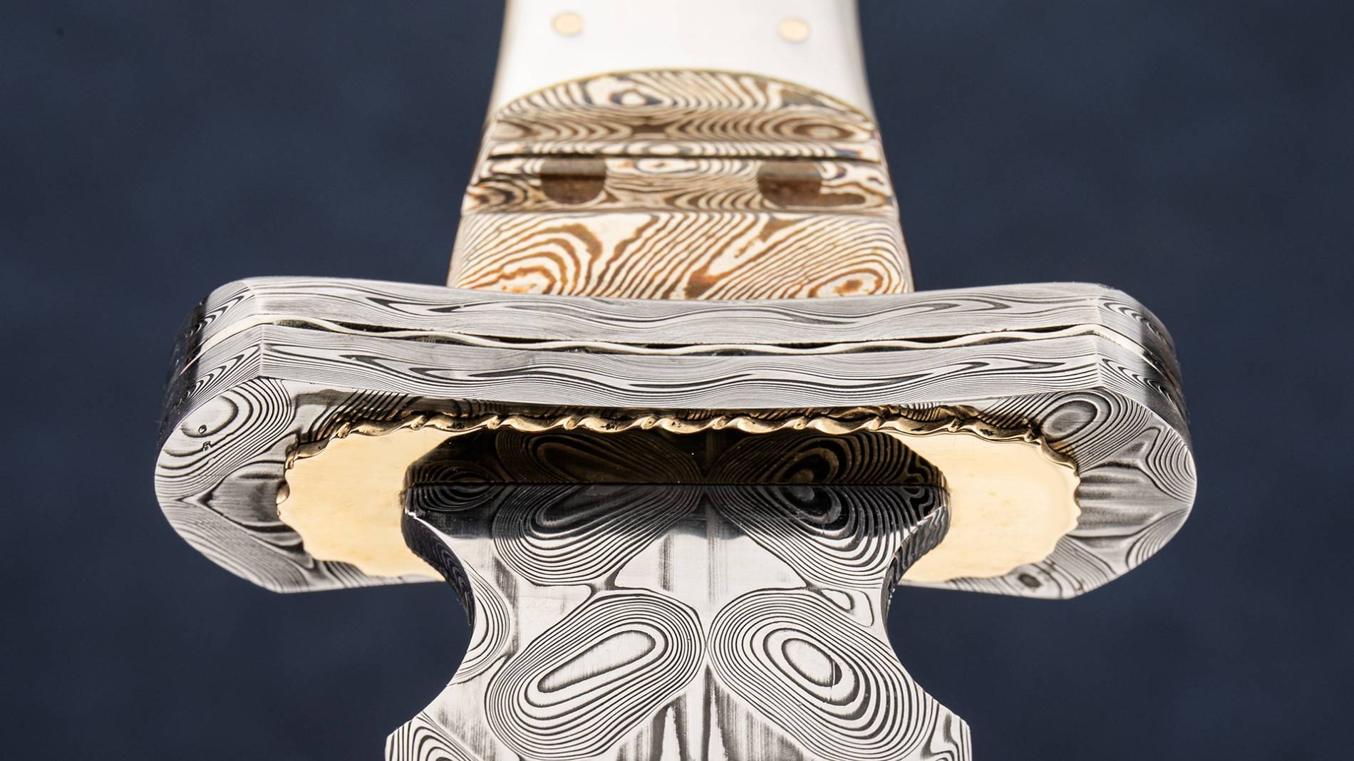 剑刃采用瑞典粉末大马士革制作而成,花纹对称细腻,如同平静水面泛起的涟漪优美动人。剑刃与护手的连接部位采用了一大块18K金垫片,侧面还制作了精美衬花,奢华闪耀。护手采用两块厚实的瑞粉大马士革制作而成,中间带有不锈钢衬花夹层。剑颈采用精美铜马士革制作而成;剑柄采用精美珍珠贝母制作,每侧采用12枚18K金铆钉固定装饰,华丽柔美。
