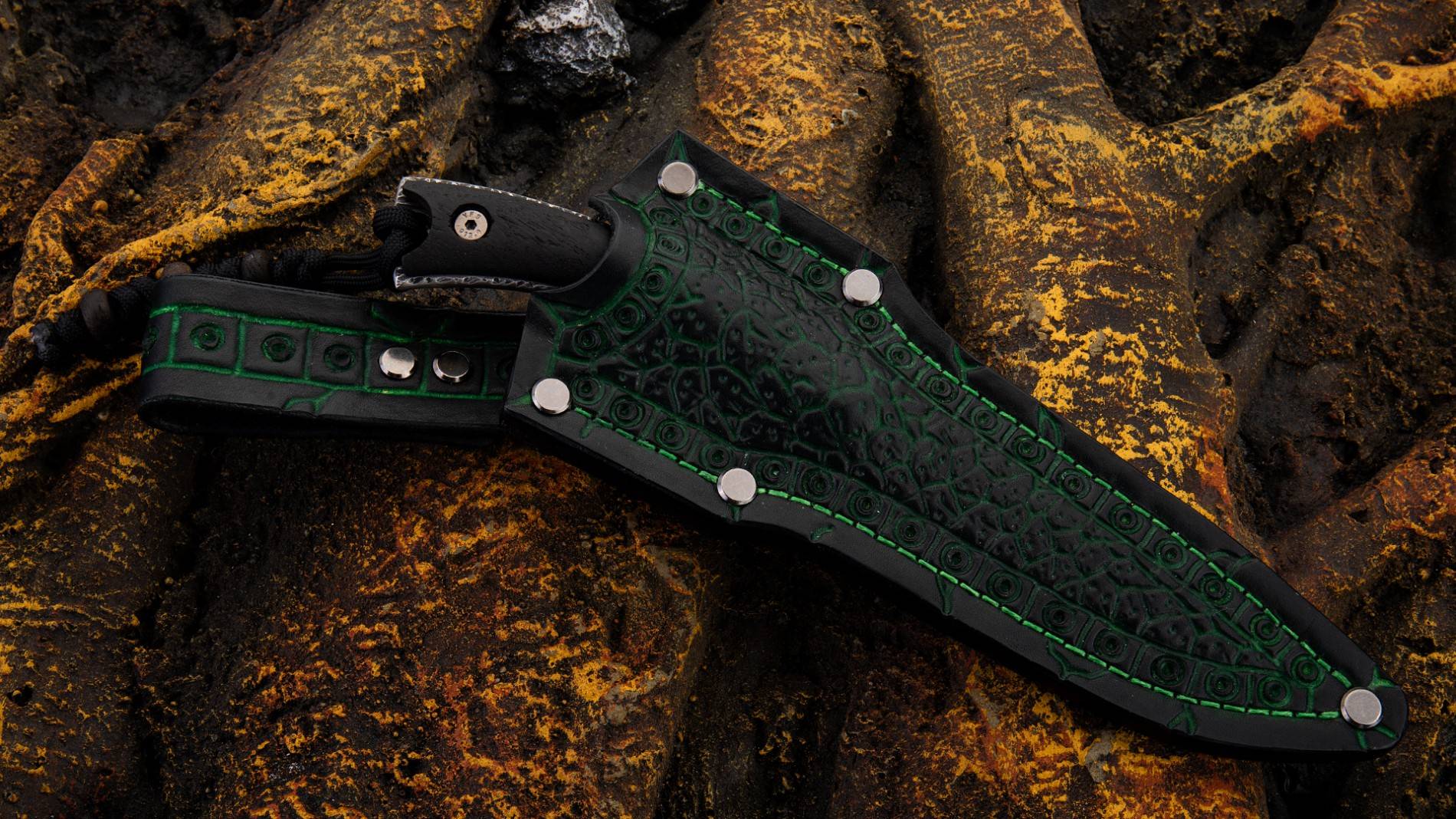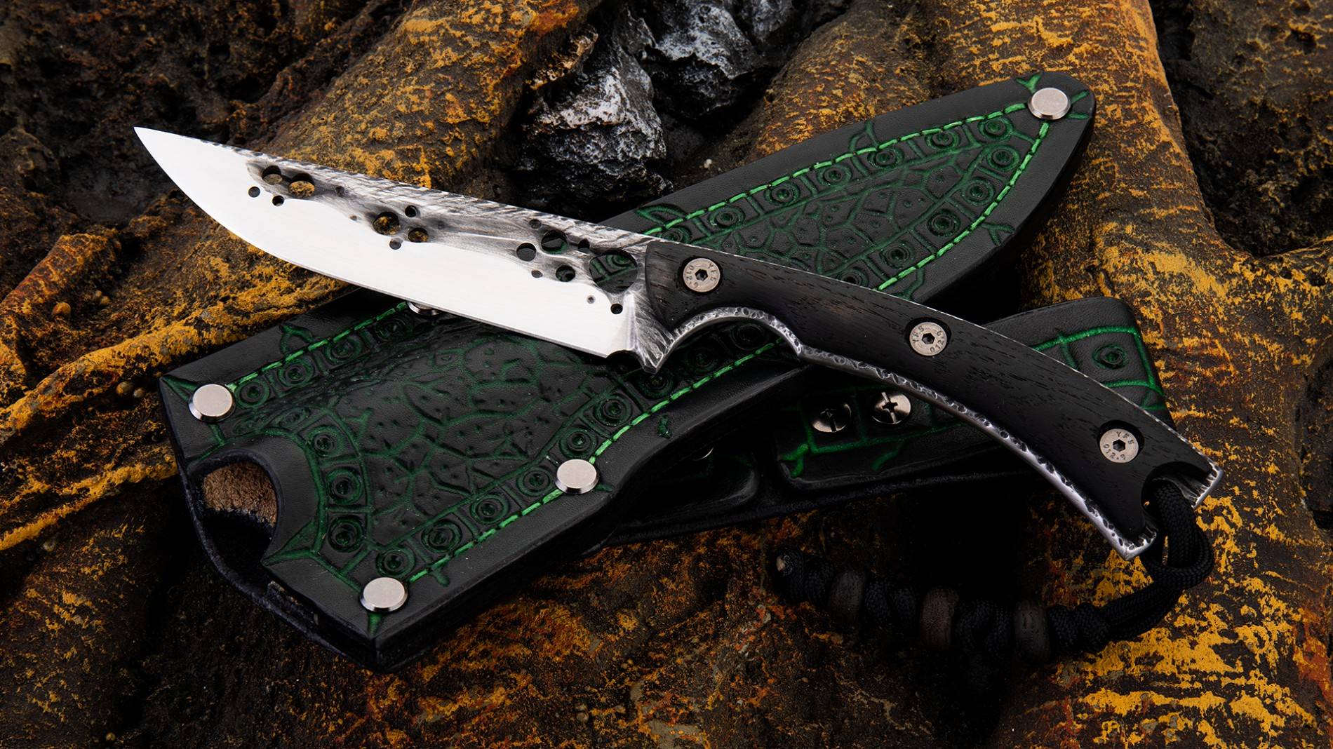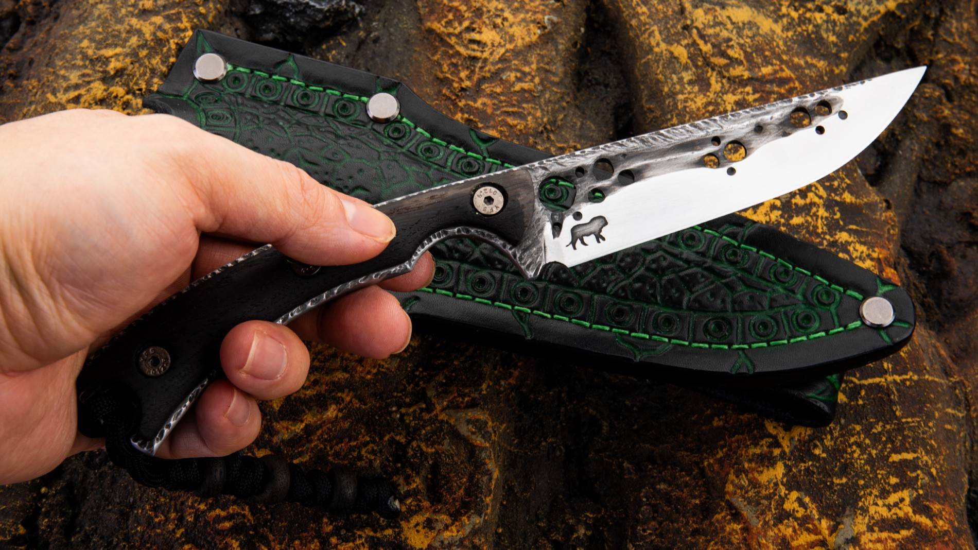 这件作品全长约25厘米,裸重170克。刀刃长12厘米,采用全碳钢手工锻造,并残留了原始锻痕,并在其区域进行大量的钻孔处理,在视觉上保留了层次感和野性的基调同时,对刀整体进行减重以获得更优秀的手感;艺术效果也非常突出,如同自然风化形成的洞穴效果,非常酷炫。刀柄采用乌木打造,形制上进行了人体工学优化,握持更有信心。作品配伞绳尾挂,和非常炫酷厚重的手工压花皮鞘,逼格满满,值得拥有。