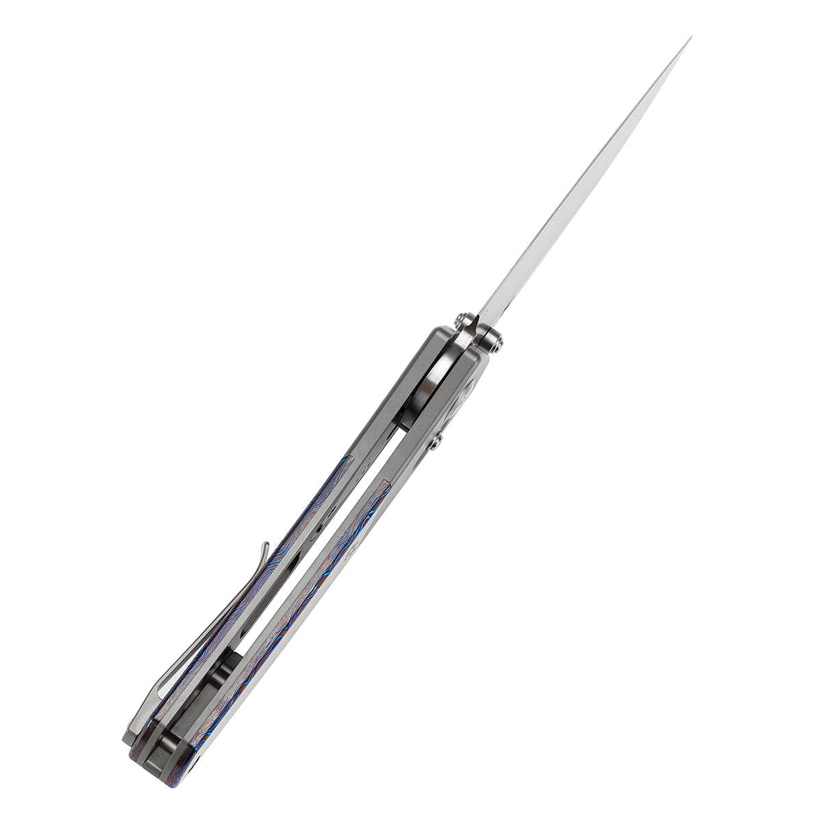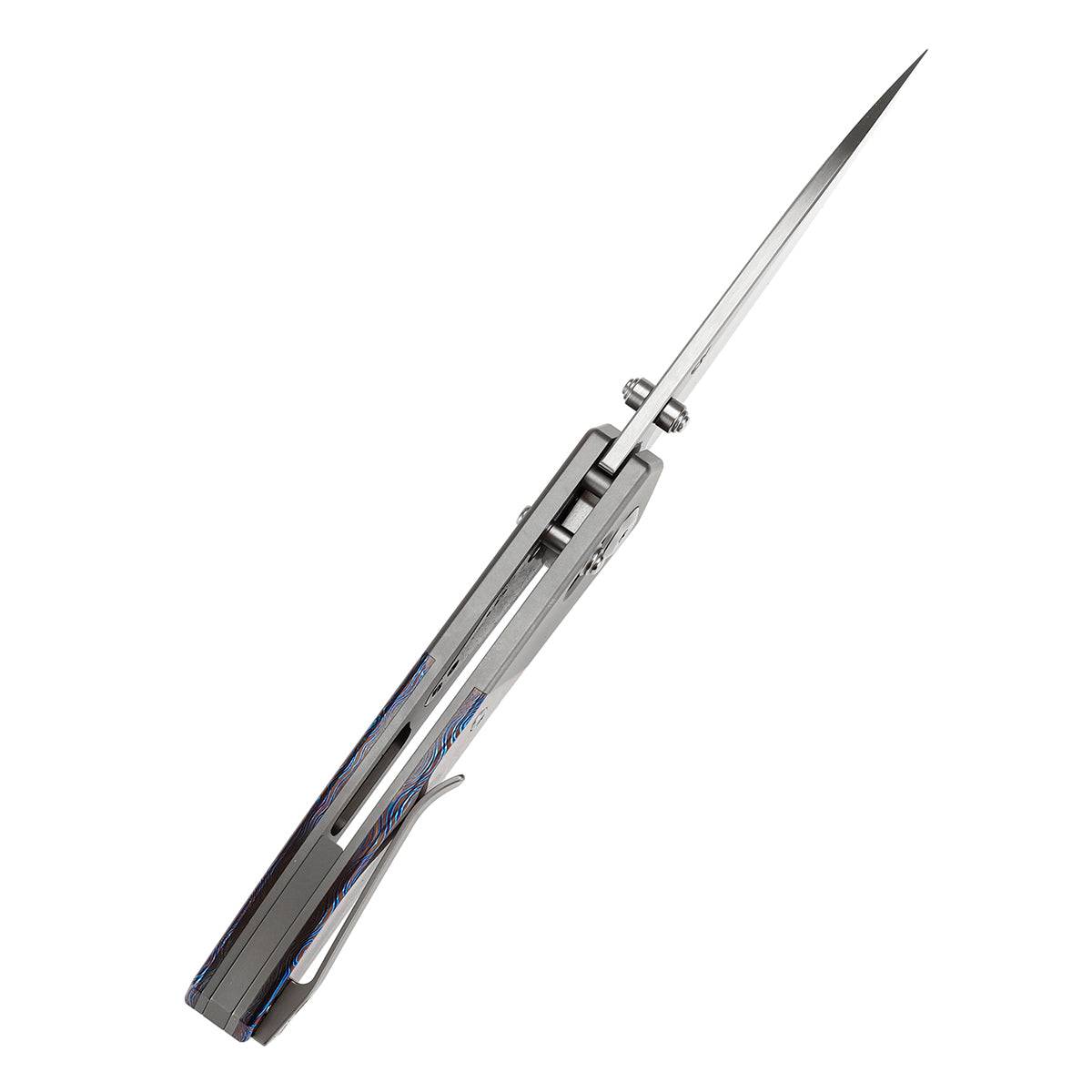 手柄由钛和脂肪碳/碳纤维/Timascus/Micarta 组合制成,兼具强度和视觉吸引力。手柄具有微妙的弧度,自然贴合手部轮廓,倒角边缘可实现光滑舒适的握持。