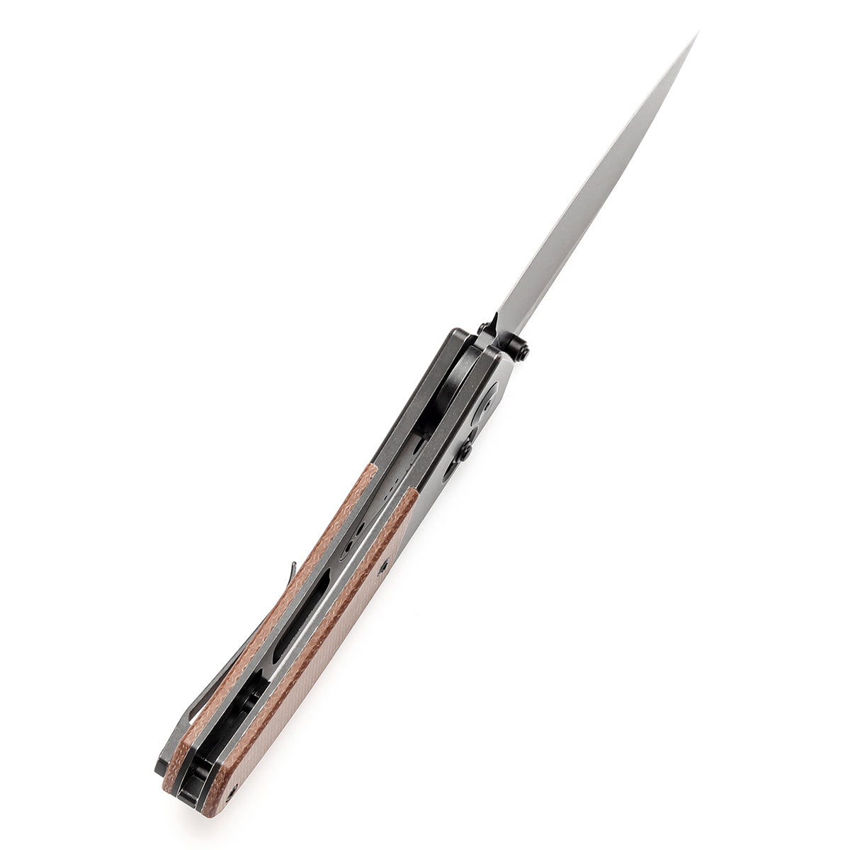 手柄由钛和脂肪碳/碳纤维/Timascus/Micarta 组合制成,兼具强度和视觉吸引力。手柄具有微妙的弧度,自然贴合手部轮廓,倒角边缘可实现光滑舒适的握持。