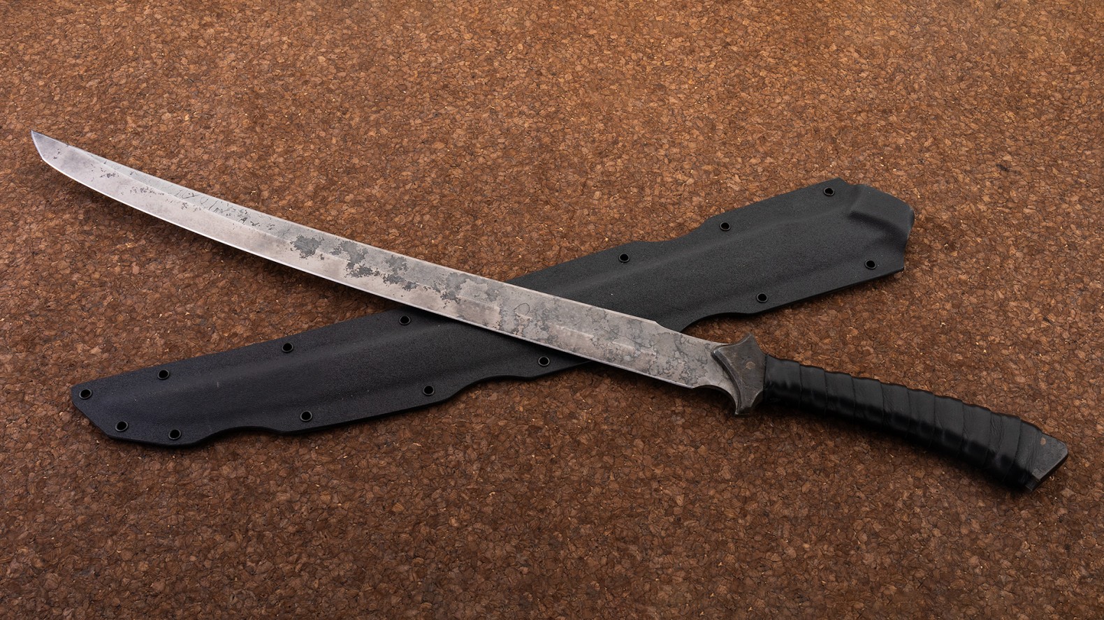 扎卡苏(原型版)——绝版多年,僵尸刀最火爆的款式扎卡苏最初的模样,离初次贩售已有11年历史!现图仅一张,可遇不可求!来自美国赫赫有名的僵尸战术刀出品,其创立初衷非常独特,专门制作末日求生与僵尸搏杀的武器。所以制作的刀具都相当魁梧、锋利,实用性极强,夸张的外形充满个性,深受广大刀友喜爱。扎卡苏英译来自日本刀胁差,刃型修长,后期版本增加了刀镡设计更加贴合日本刀风格,原型版本则更有美式的凶悍风。全长77厘米,刃长57厘米,重1170克,采用5160弹簧钢制成,表面酸洗处理,营造出原始野性的装饰效果。手柄处坎嵌T6铝、外层皮革包裹,防滑吸汗,握持不易脱手,配有战术K鞘收纳。由于僵尸刀广大的受众群体,绝版作品在海外亦是相当抢手,价格很高且不易获得,可谓是僵尸刀骨灰级藏品。