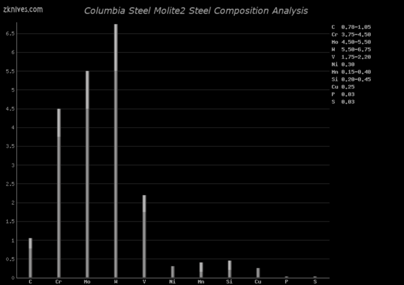 Molite2(哥伦比亚钢铁)- 是一种高速工具钢,已经存在了一段时间。它是定制刀具以及高端和限量版生产刀具的常见选择。早在90年代,Gerber就使用这种钢材。作为一种高速工具钢,M2钢即使在非常高的温度下也能保持其硬度,因此在工业中用于高温切割工作,例如钻头和其他金属切削工具。尽管这些用途与常规刀具的设计目标不同,但就常规刀具而言,M2钢在相同硬度下相较于像AISI D2这样受欢迎的刀具钢,具有更好的耐磨性和韧性。M2钢是更好的刀具钢,除非不耐腐蚀性是一个问题。Benchmade曾在几款刀具中使用M2钢,包括AFCK、710 HSS McHenry和Williams、Nimravus HSS、Ares等。通常生产刀具的硬度大约是60-62HRC,但这并不是最理想的硬度,至少对于追求最佳切割效率和保持刃口的刀具来说,60HRC并不是最优选择。我使用过的64HRC的M2钢刀具相较于60HRC的要好很多。在较低硬度下,M2钢可以用于中型/大型刀具进行重型工作,但为什么要这样做呢?有更好的选择,例如CPM 3V。对于薄型、高性能的切割工具,高硬度的M2钢表现非常好。尽管如此,随着大约从2005年开始,M2钢被AISI M4高速工具钢取代,后者能够达到更高的硬度,更重要的是在相同硬度下具有更好的韧性,这意味着更好的刃口保持能力。