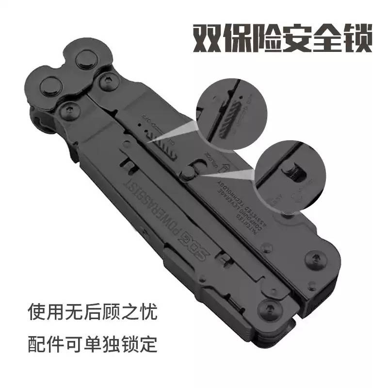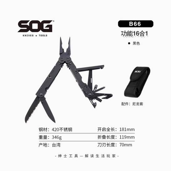 SOG B66是一款经典的多功能钳,专为美国军方拆弹部队设计,采用420不锈钢材质,表面做旧处理,耐磨且具战术隐蔽性。其采用专利杠杆复合结构,单手可操作,拥有16种功能,包括尖嘴钳、螺丝钳、剪线钳、硬线钳、卷线压紧口、爆破雷管封口器等,满足专业与日常需求。闭合尺寸119mm×43mm×19mm,重约343克,配有尼龙腰套,便于携带,是户外、居家的得力助手。