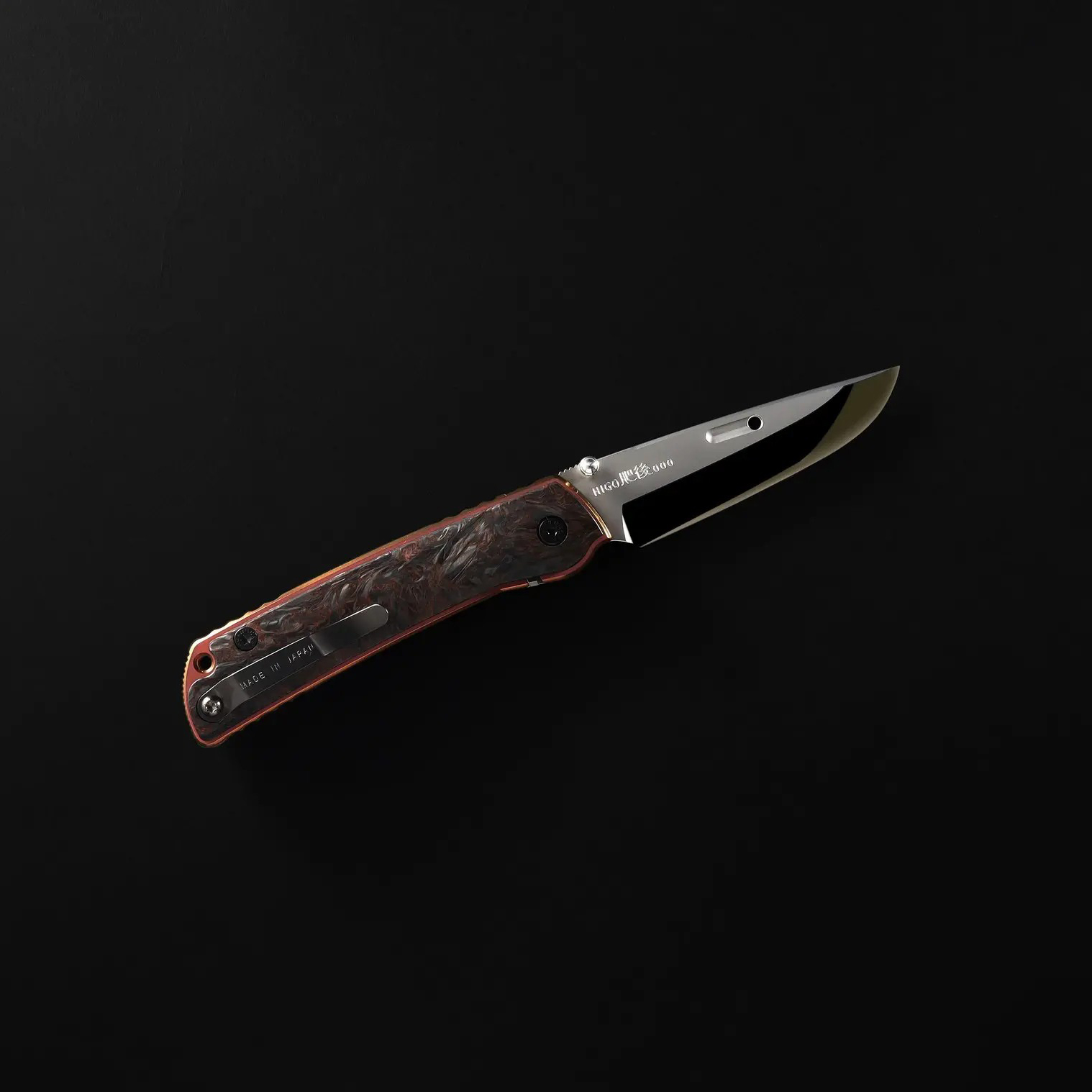 HIGOⅡ X-FCF-ZDP (BDR) 总重量: 138克 刀片长度: 89毫米 刀片材质 :ZDP189 覆以 VG10 刀片厚度: 3.2毫米 刀片硬度: 约 67 HRc 手柄材质: 钛合金与碳纤维 HIGOⅡX还有更多型号。这款采用碳纤维材质,...