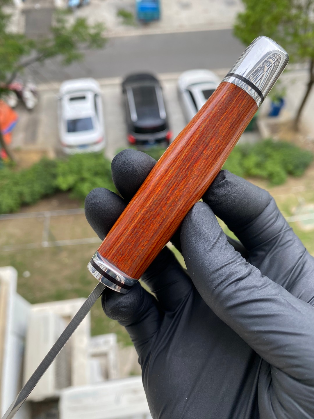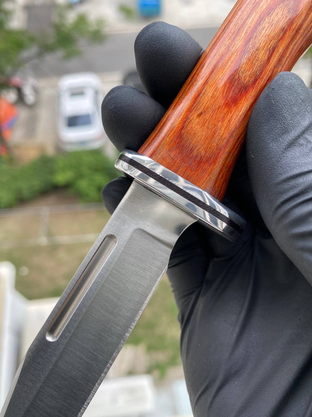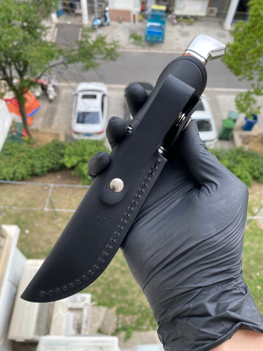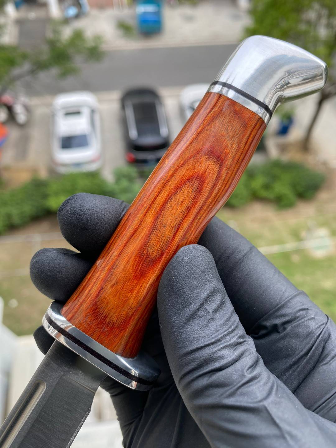 DymaLux Cocobolo 木质手柄,搭配镍银柄头和护手,提供稳固的握持感,并拥有优雅经典的设计。优质黑色皮革刀鞘确保安全便捷的携带。