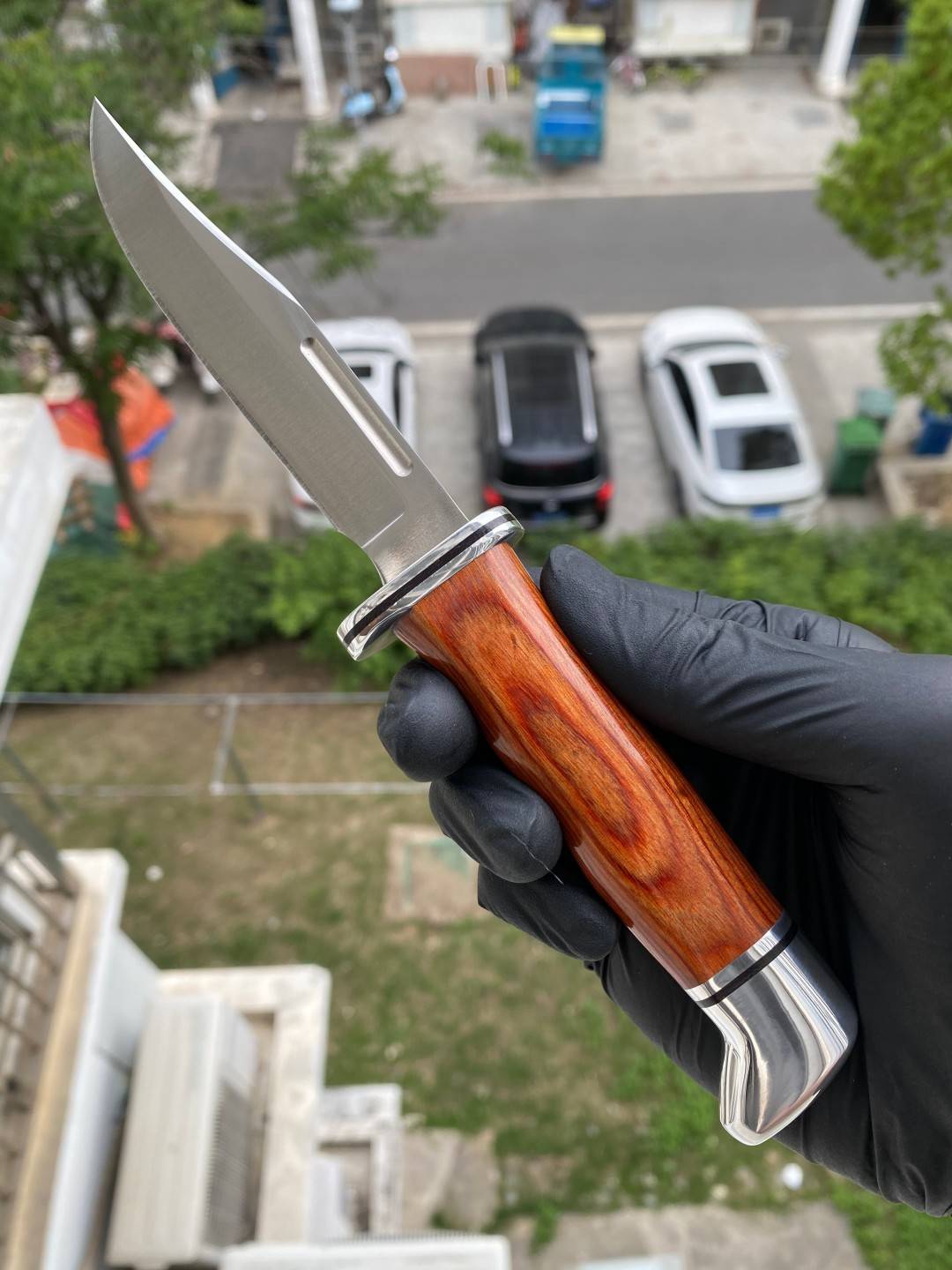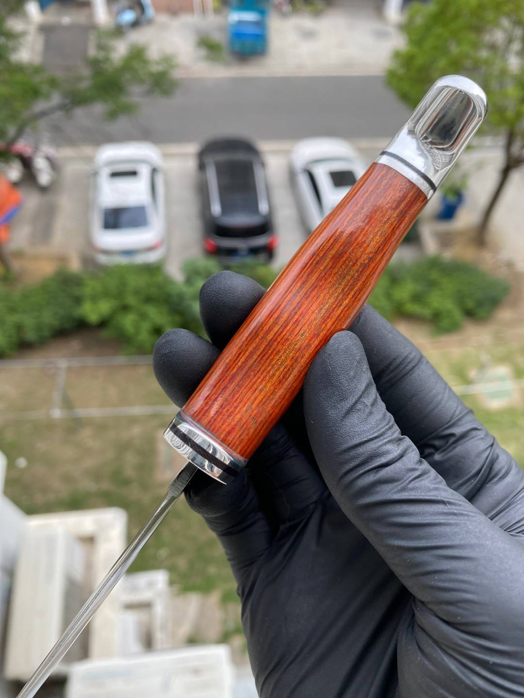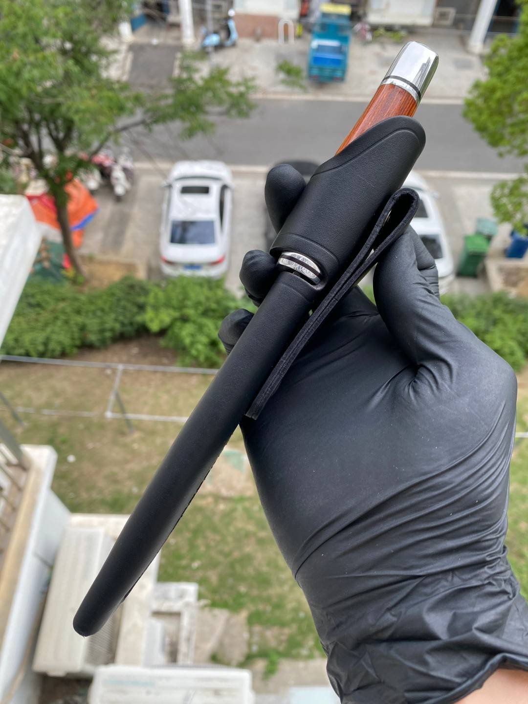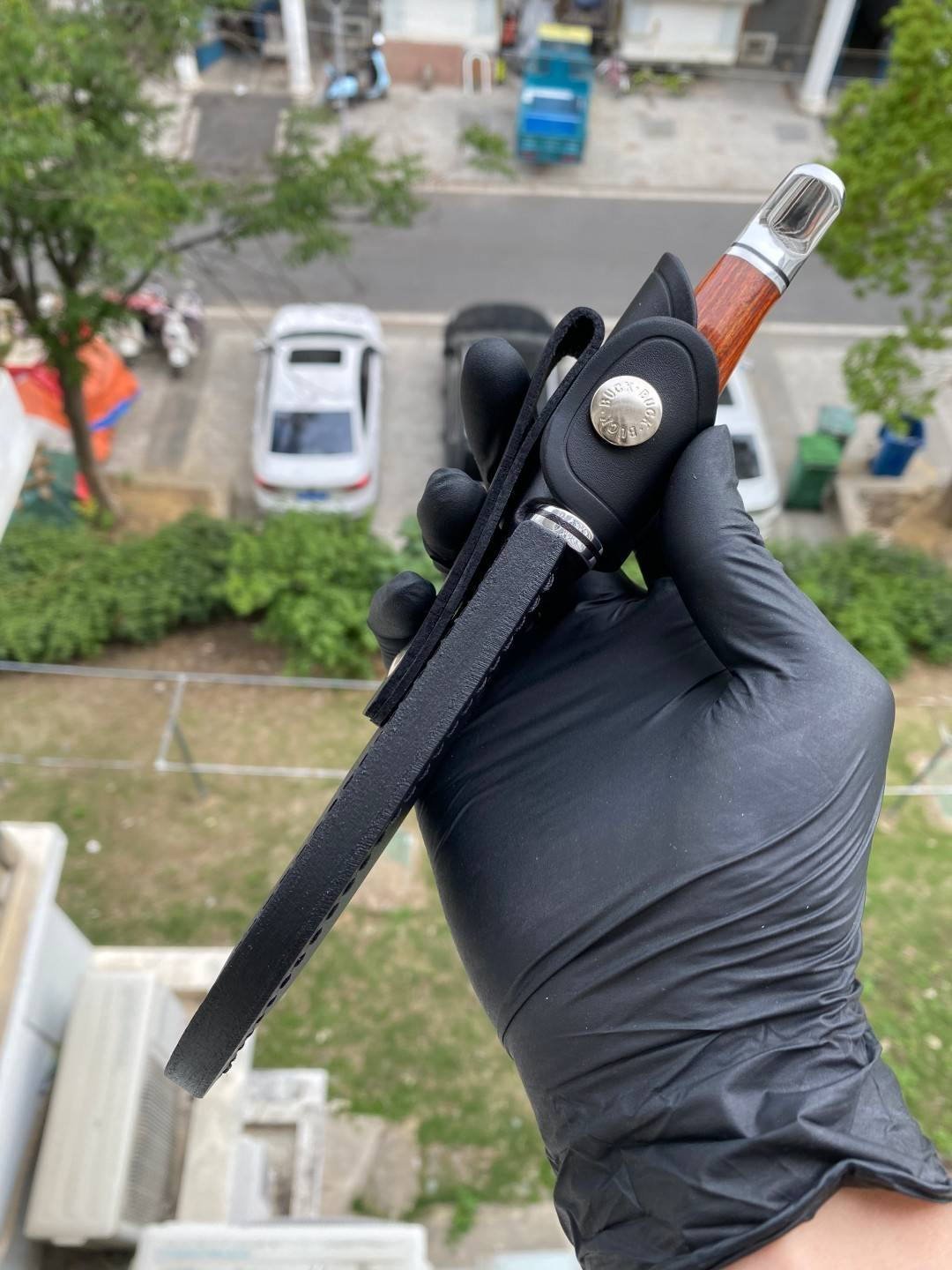 DymaLux Cocobolo 木质手柄,搭配镍银柄头和护手,提供稳固的握持感,并拥有优雅经典的设计。优质黑色皮革刀鞘确保安全便捷的携带。