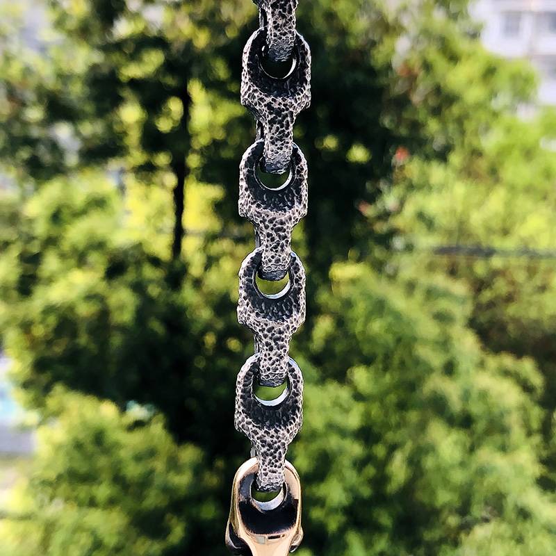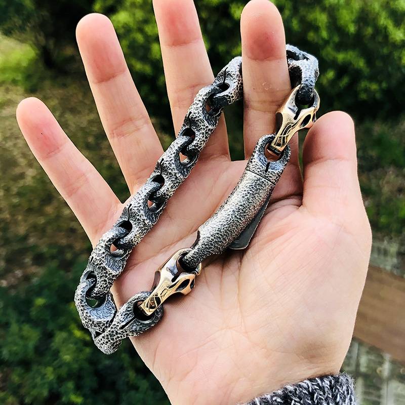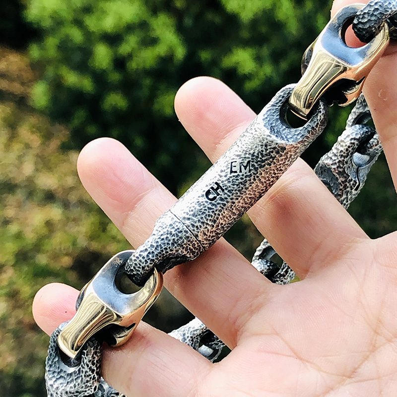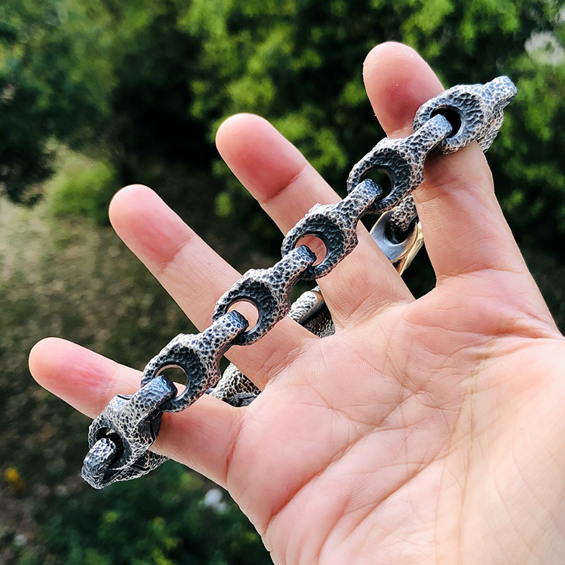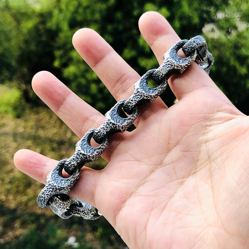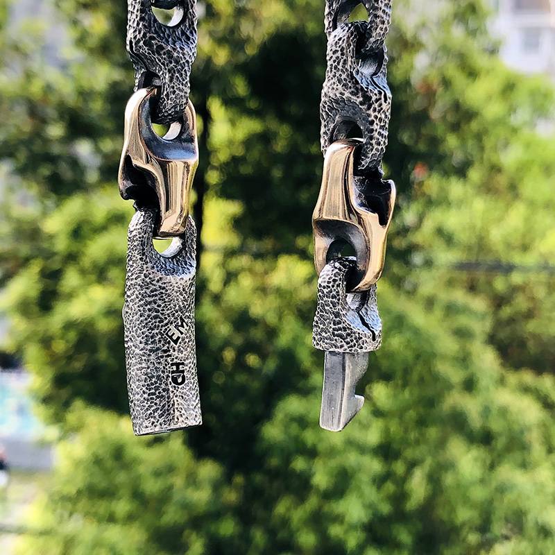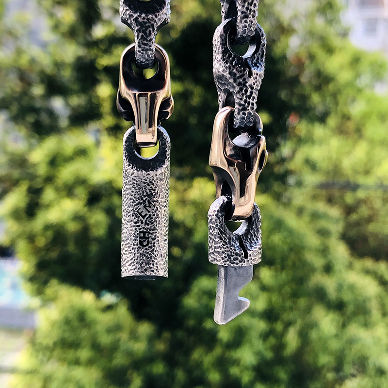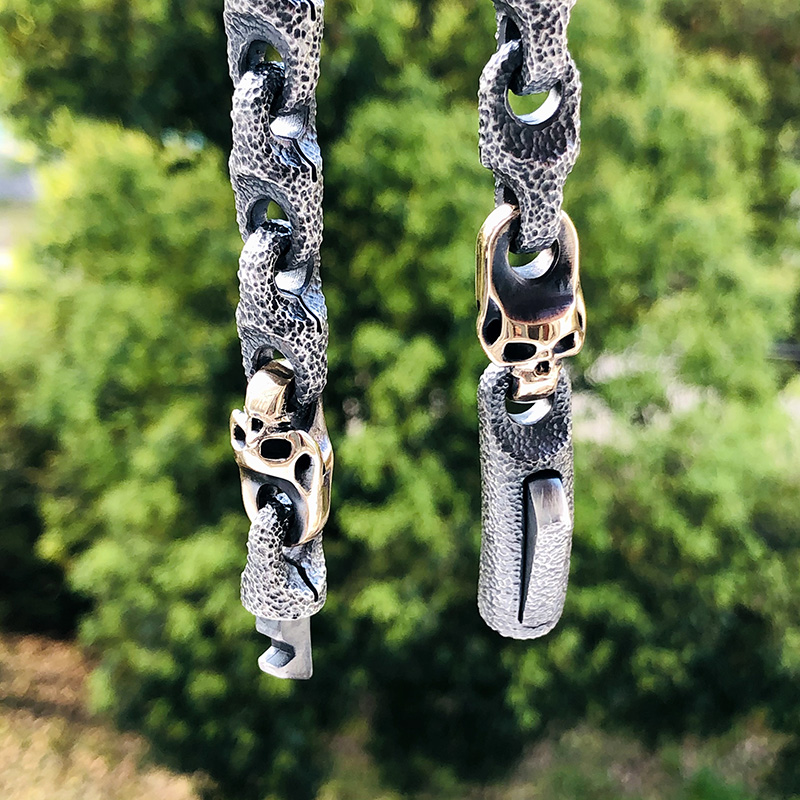 此款作为为铜斑蛇2019年bladeshow的展品,数量少之又少,据悉此款发布约为10个左右。由于每款产品都是手工制作,少量现货发售,很多产品都是预订方式,从展会之前我们就开始预订此款产品,经过将近两年时间才到货,预定周期比较长。产品整体采用925银制作而成,接口处拥有两个骷髅连接在一起。